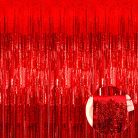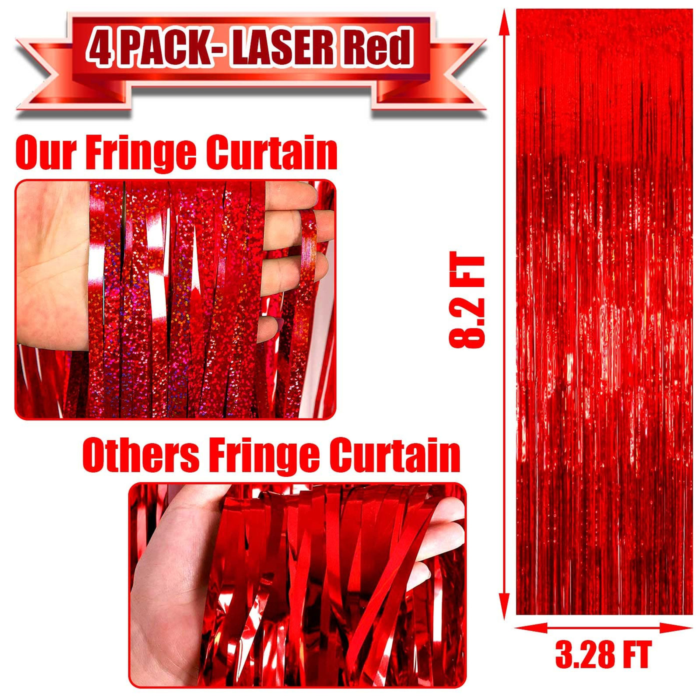 Q: What are the dimensions of each fringe curtain in the 4 Pack Red Tinsel Foil Fringe Curtain Backdrop?A: Each metallic tinsel foil fringe curtain measures 3.28 feet wide and 8.2 feet long, making them ideal for various decorative uses at your events.
