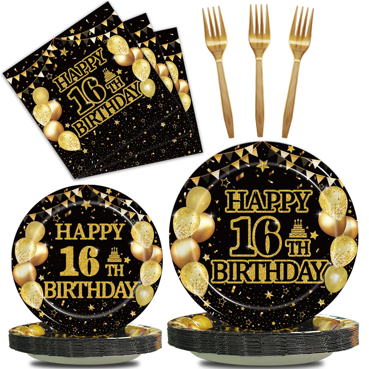 96Pcs 16Th Birthday Party Tableware Set, Black Gold Cheers To 16 Years Party Decorations Supplies 16 Years Old Birthday Party De