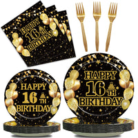 Q: Can I use these decorations for both boys and girls' birthday parties?A: Absolutely! The black and gold design with the 'Happy 16th Birthday' print makes this tableware set suitable for both boys and girls, adding a stylish touch to any 16th birthday celebration.