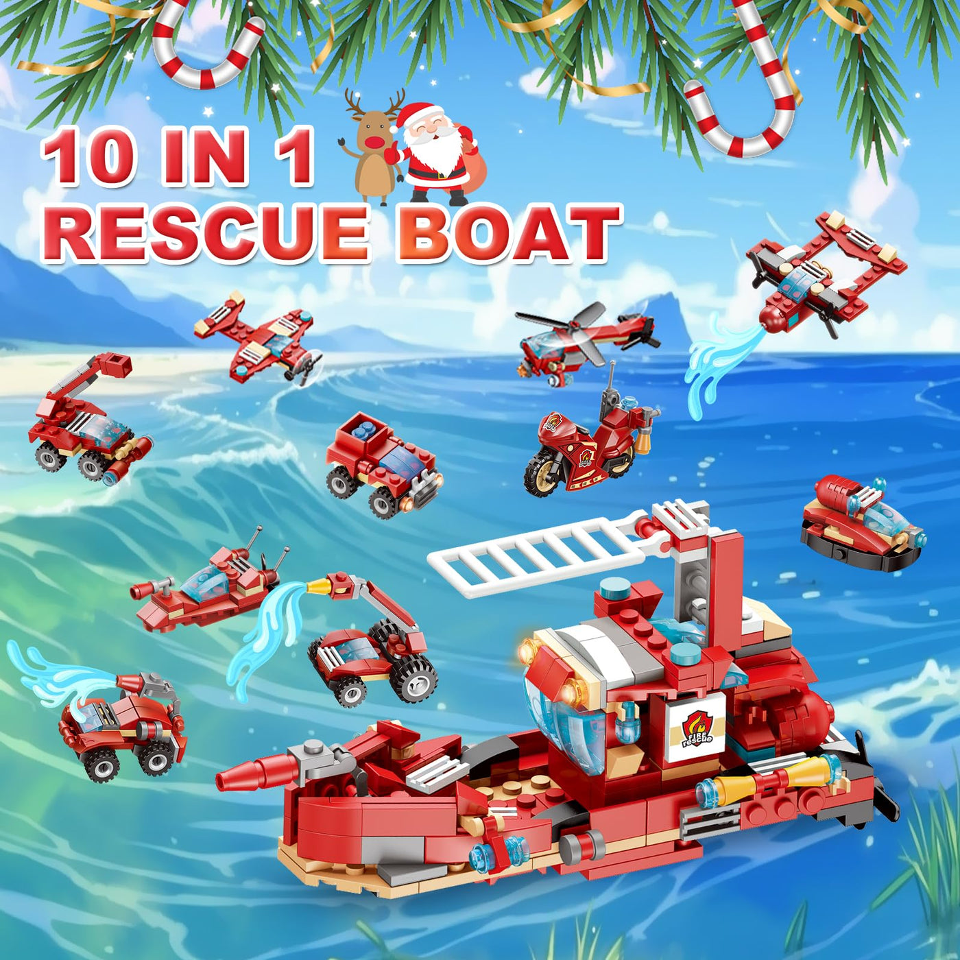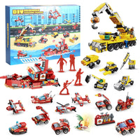 Q: What types of vehicles are included in the Advent Calendar?A: This Advent Calendar contains a variety of block vehicle sets, including a rescue airplane, water and underwater rescue boats, a rescue car, a motorcycle, and firefighting figures, providing a diverse play experience.