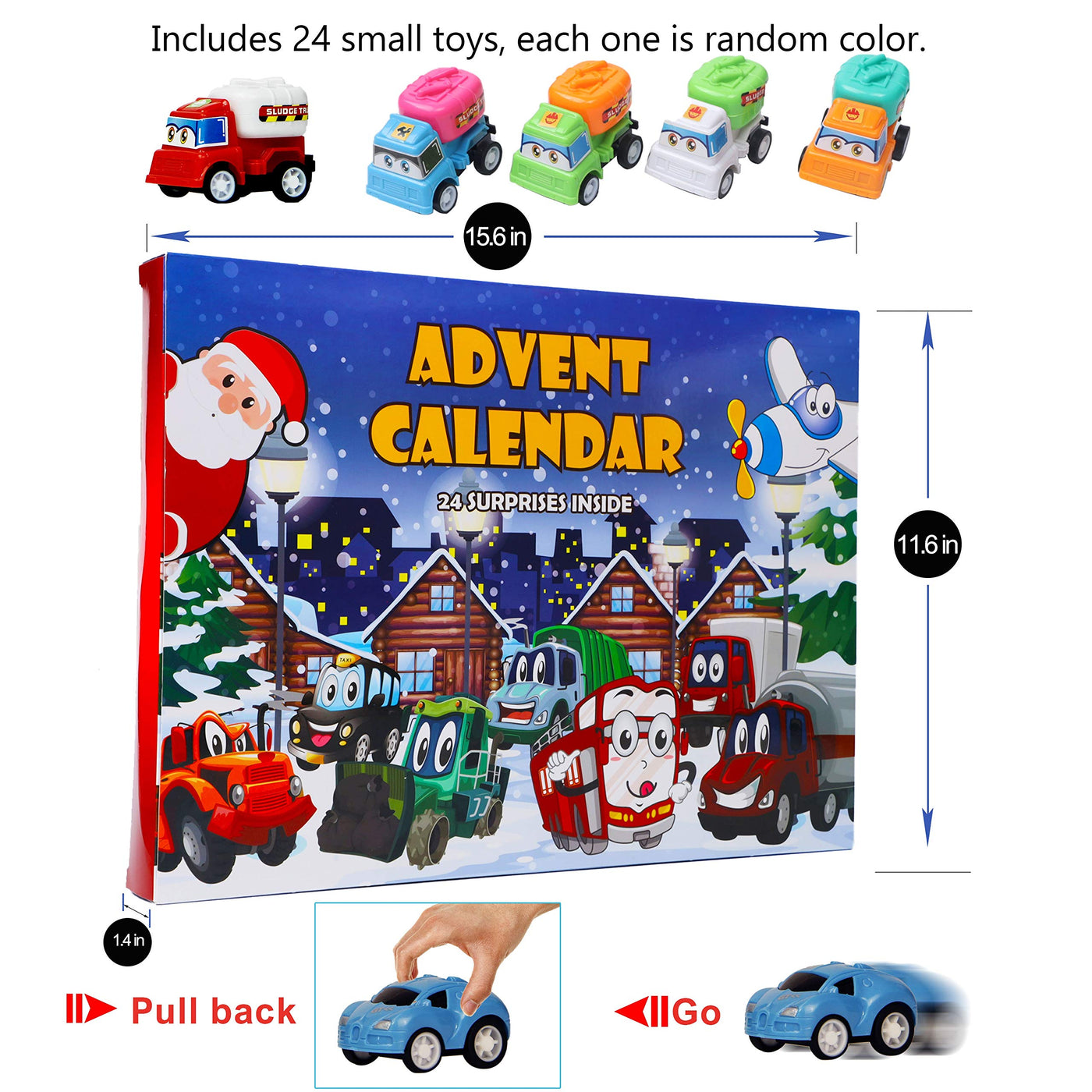 Q: How many vehicles are included in the advent calendar?A: The advent calendar includes 24 different vehicle toys, providing a fun surprise each day leading up to Christmas.