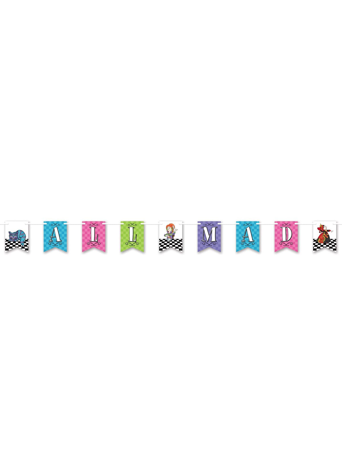Never ending adventures in Wonderland. Create a party to remember with a 'we're all Mad here' Pennant banner. This banner is the perfect decoration for party time fun during tea time gatherings, Alice in Wonderland celebrations, and princess events. One banner per package. Approximately 12' Long. Made of cardstock. 19 4' X 6' Cards on banner. Unique Alice in Wonderland decorations are essentials for premier parties and costume events. Stock up on the white rabbit party supplies you need to make your event unforgettable.
