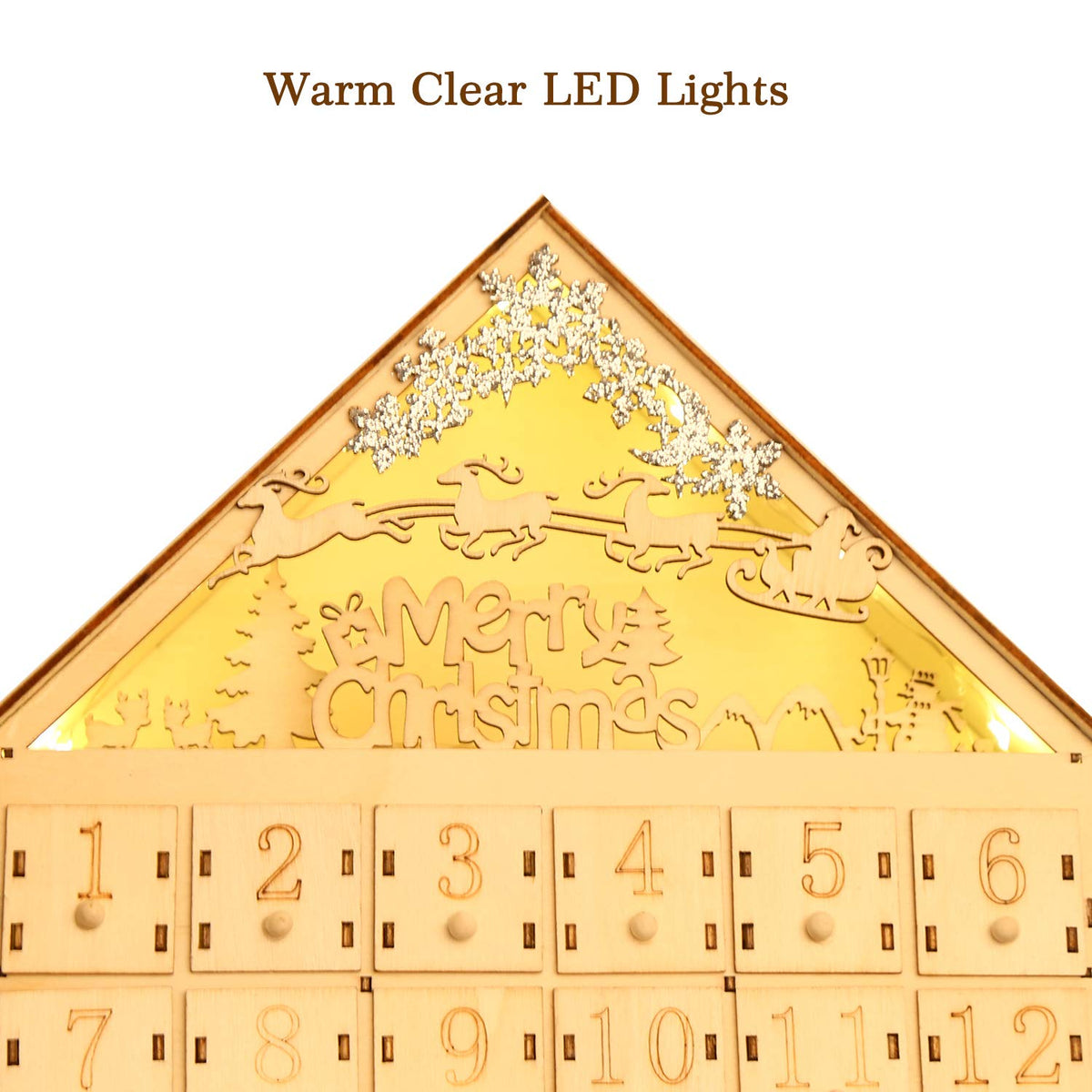 Ccinee Christmas Wooden Advent Calender With Led Light Xmas House Shaped Advert Calendar 24 Days Storage Drawers Christmas Countdown Calender For Holiday Decoration Features Ccinee Advert Calendars Are Made From Premium Quality Wood,Sturdy And Durable.Comes With Built-In Led Lights For Bringing More Warm Color To Your Home. With Premium Workmanship,The Nativity Advert Calendar Has Seamless Look And Smooth Touch.Attached With Engraved Figures And Patterns To Creat Vivid Effect.Adorable And Gorgeous! 24 Drawers Are Available For Allowing You To Put Treats And Gifts In It.Kids Will Be Delighted When They Open The Drawer During Holiday Season. The Wodden Advert Calendars Are Perfect Decoration For Christmas,Great For Bringing Christmas Spirits And Joyment To Your Home. Note:Please Notice That The Batteries Are Not Included.Please Pay Attention To Put The Batteries In Right Ways.