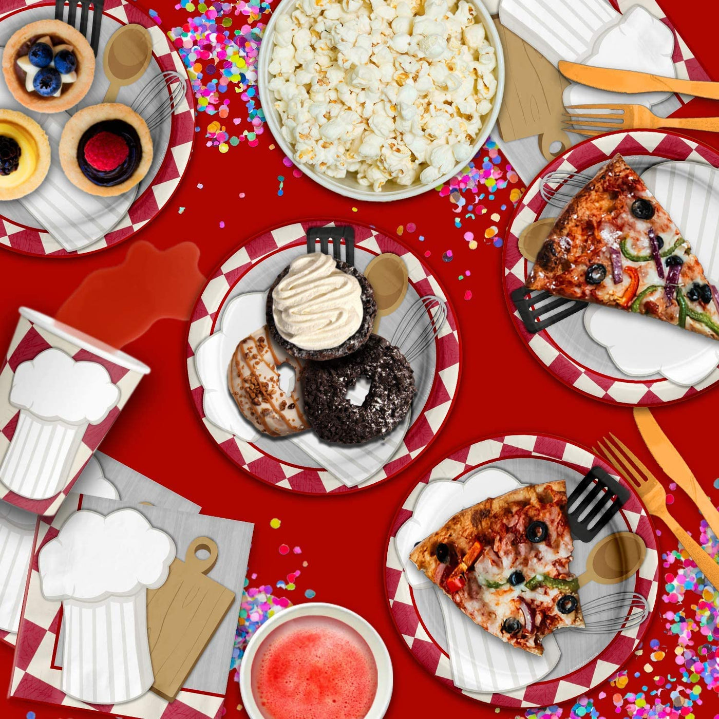 Q: What makes the graphic design of this tableware unique?A: The graphic design of the Chef Cooking Birthday Party Supplies Set features playful illustrations and a vibrant mix of colors, creating an eye-catching and dynamic feel that enhances your party decorations.