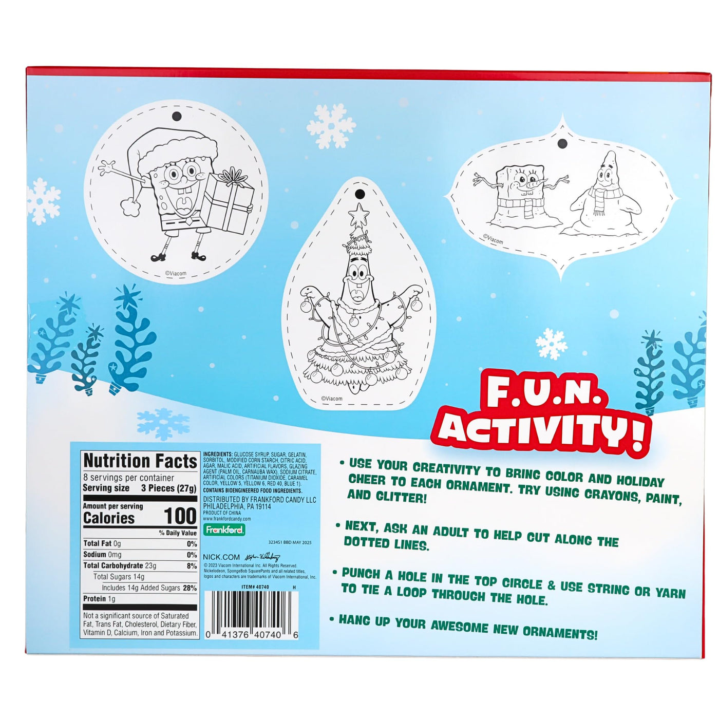 Q: What is included in the Frankford SpongeBob SquarePants Advent Calendar?A: The Frankford SpongeBob SquarePants Advent Calendar includes 24 individually wrapped Krabby Patty treats, each featuring a variety of fun shapes and flavors like green apple, blue raspberry, cherry, and grape.
