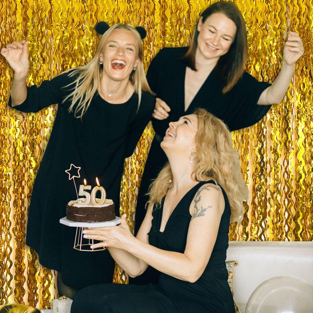 Q: What types of events are these gold decorations suitable for?A: These Gold Streamers Backdrop Curtains are perfect for a variety of events including birthdays, graduations, bachelorette parties, anniversaries, and New Year's Eve celebrations.