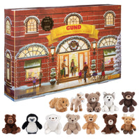 Q: How many plush toys are included in the advent calendar?A: This advent calendar includes 12 mini 4-inch plush toys hidden behind each window, featuring iconic animals such as teddy bears and playful puppies.