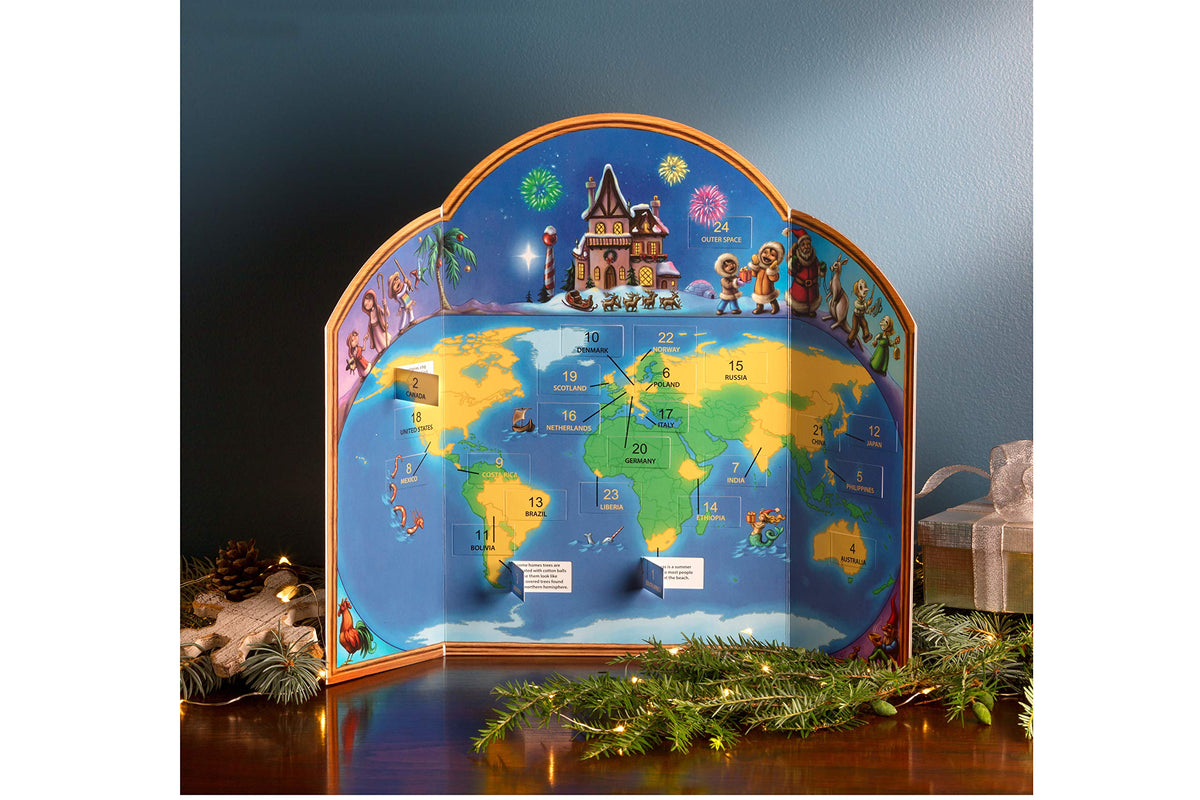 Q: How does this Advent calendar educate about Christmas traditions?A: This Advent calendar features 24 windows, each revealing a Christmas tradition from 23 different countries and one fact about Christmas in outer space, providing an engaging way for children to learn about global cultures and geography.