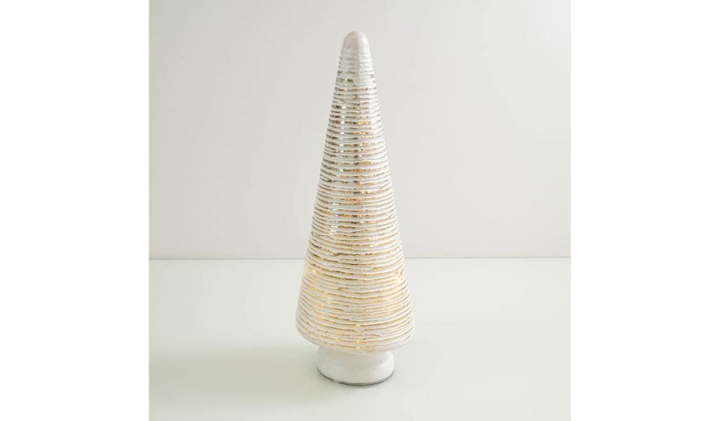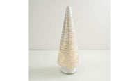 Add some holiday cheer to your space with this 18-inch LED Lighted White and Gold Glass Christmas Tree Sculpture. This charming decorative accent is expertly crafted from high-quality glass in a white and gold coloration. Complement your room with this elegant sculpture in a white and gold coloration. It is a perfect addition for those who love a trendy look and feel. Use this piece as a shelf decoration, on your desk, coffee table, or anywhere in your home. 18 inches tall x 6 inches wide x 6 inches deep