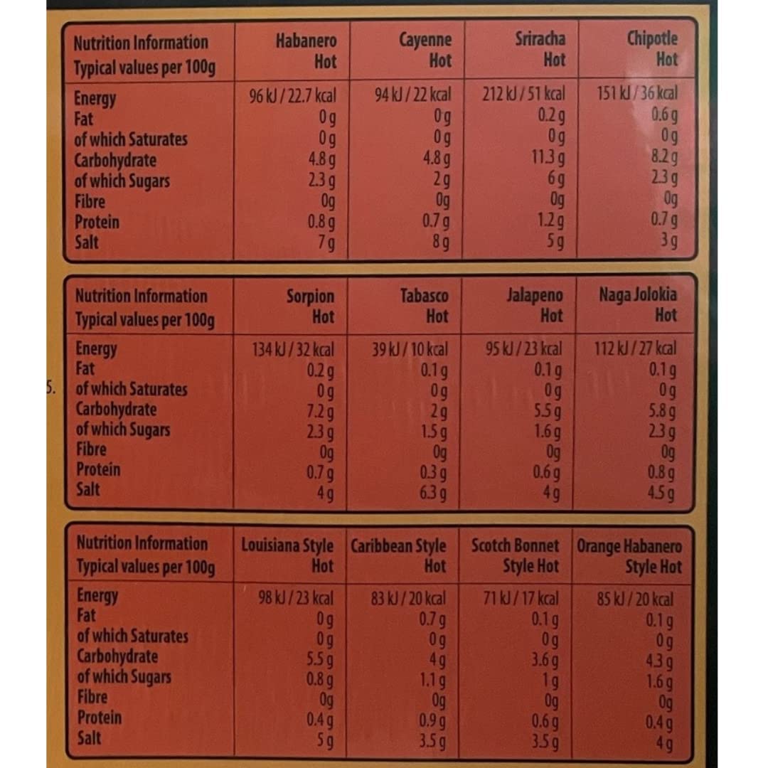 Q: What flavors are included in the Hot Sauce Advent Calendar?A: The Hot Sauce Advent Calendar features 12 fiery flavors, including habanero, cayenne pepper, sriracha sauce, chipotle sauce, scorpion sauce, tabasco sauce, jalapeno, Naga Jolokia, Louisiana style sauce, Caribbean style, scotch bonnet, and orange habanero hot sauce.