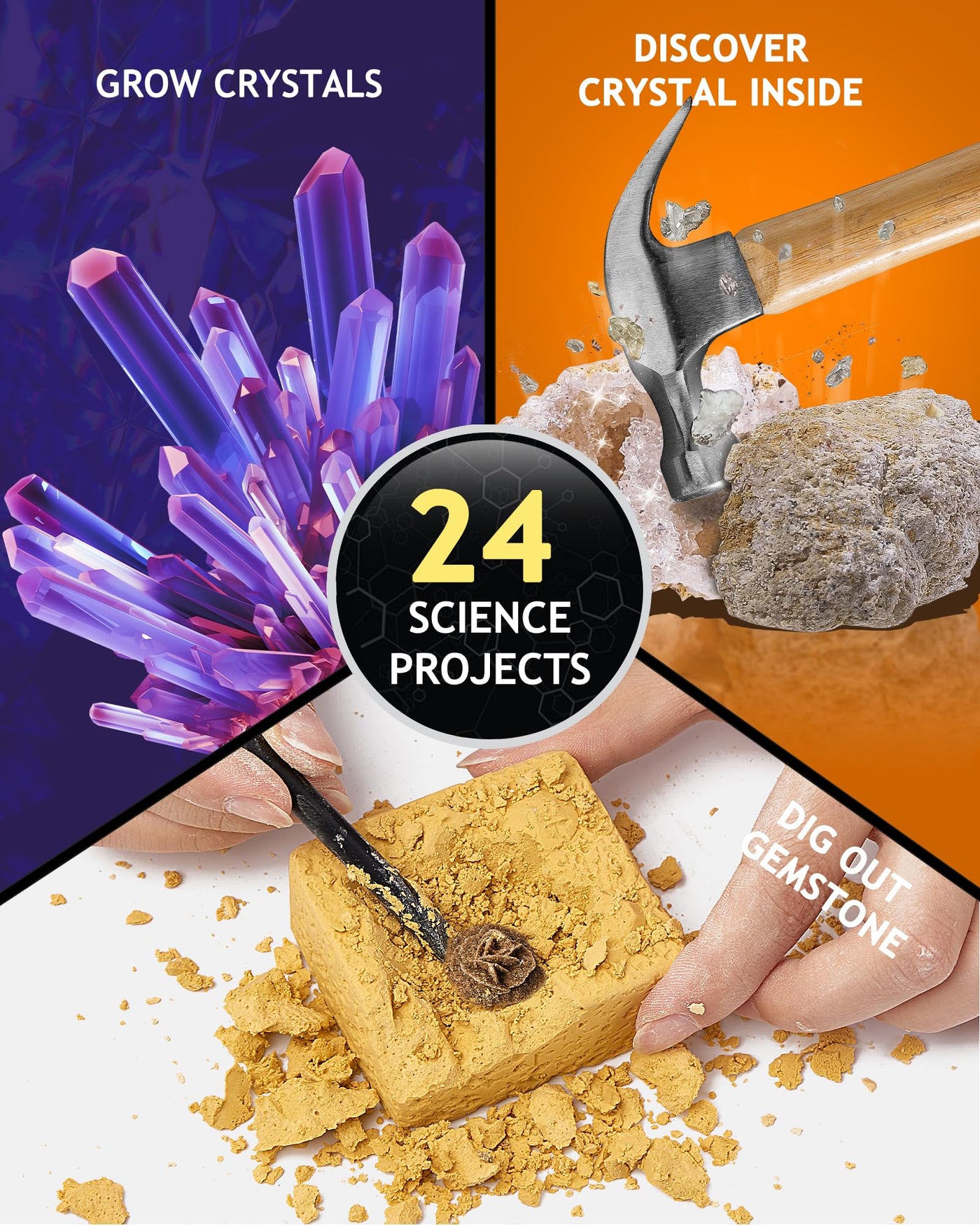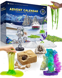 Q: What kind of experiments can kids perform with this advent calendar?A: Kids can conduct a variety of exciting experiments including digging out gemstones, growing crystals, making slime, and creating glow-in-the-dark reactions, among others. Each day features a new science project to keep them engaged.