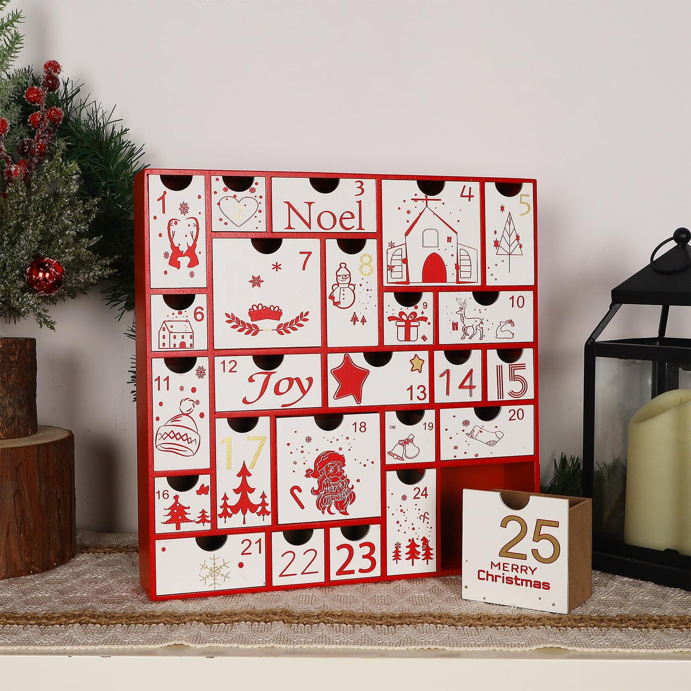 Juegoal Red Advent Calendar, 11.8 Inch Christmas Wooden Advent Calendar With 25 Large Drawers Countdown To Christmas Has Never Been So Exciting! The 25 Drawers Provide A Place To Store Small Gifts Or Treats That Kids And Adults Can Look Forward To Opening Each Day. The Drawers Have Various Sizes But Large Enough To Accommodate A Small Gift Or Sweet Surprise Such As Sweets, Small Toys, Chocolate, Make Up, Jewelry Or Festive Messages To Count Down The Days With Different Gifts, Until Dec 24Th Christmas Eve. What A Fun Way To Get Your Little Ones Excited As They Count Down To The Most Awaited Time Of The Year. Specification: Material: Premium Natural Wood Box Size: 11.8 X 2.3 X 11.8 Inch Large Square Drawer: 3 X 2 X 3 Inch Small Square Drawer -1.57 X 2 X 1.57 Inch Rectangle Drawer -3 X 2 X 1.57 Inch