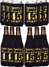 Q: What is included in the 45th Birthday Can Coolers Bundle?A: The bundle includes a total of 12 coolers: 6 black and gold can coolers and 6 black and gold bottle coolers, all featuring the festive 'Cheers to 45 Years' design.