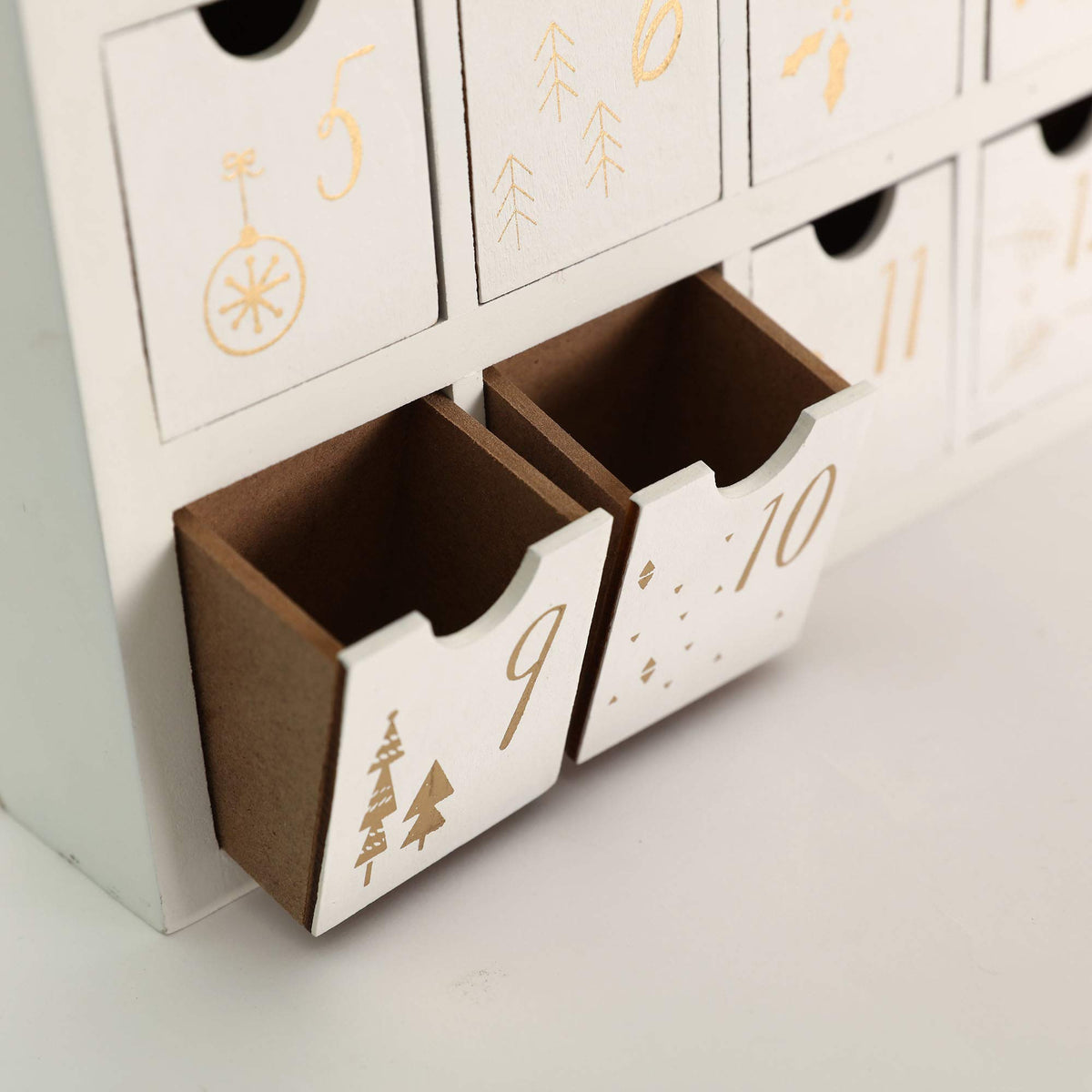 Q: What materials is the advent calendar made of?A: This advent calendar is crafted from high-quality wood, ensuring durability and a smooth finish, which highlights the intricate details of its design.