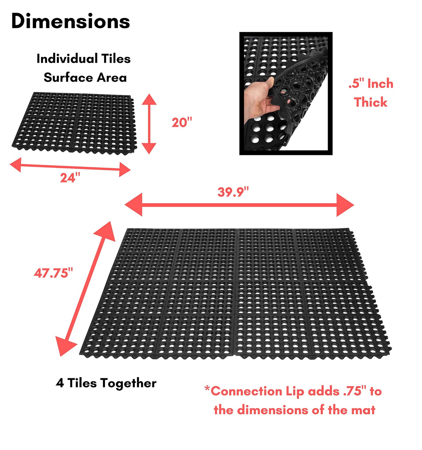 Q: What are the dimensions of each tile in the BIRDROCK HOME drainage utility mat set?A: Each tile in the BIRDROCK HOME drainage utility mat set measures 20 inches in width, 24 inches in length, and 0.5 inches in height.
