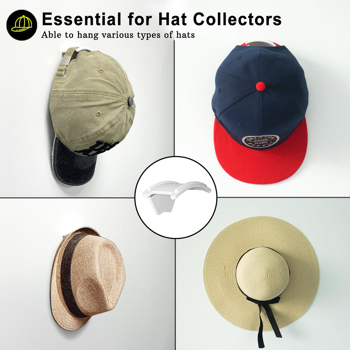 Q: Can this hat rack be used for different types of hats?A: Yes, the curved flat design of the ETOWIFA hat rack allows it to hold various types of hats, including baseball caps, cowboy hats, fitted hats, snapbacks, flat-brim hats, and visors without compromising their shape.