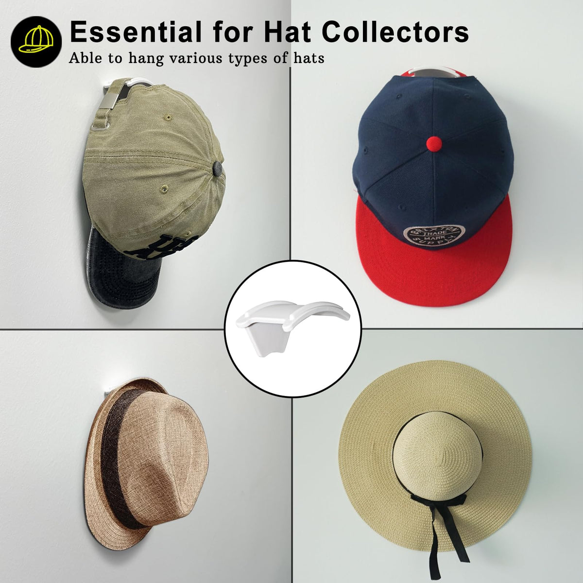 Q: Can this hat rack accommodate different types of hats?A: Absolutely! The curved flat design of the hooks allows for various types of hats, including baseball caps, cowboy hats, snapbacks, and visors, without compromising their shape.
