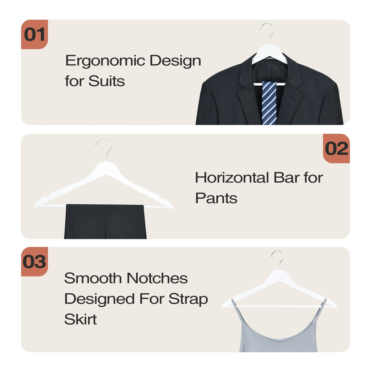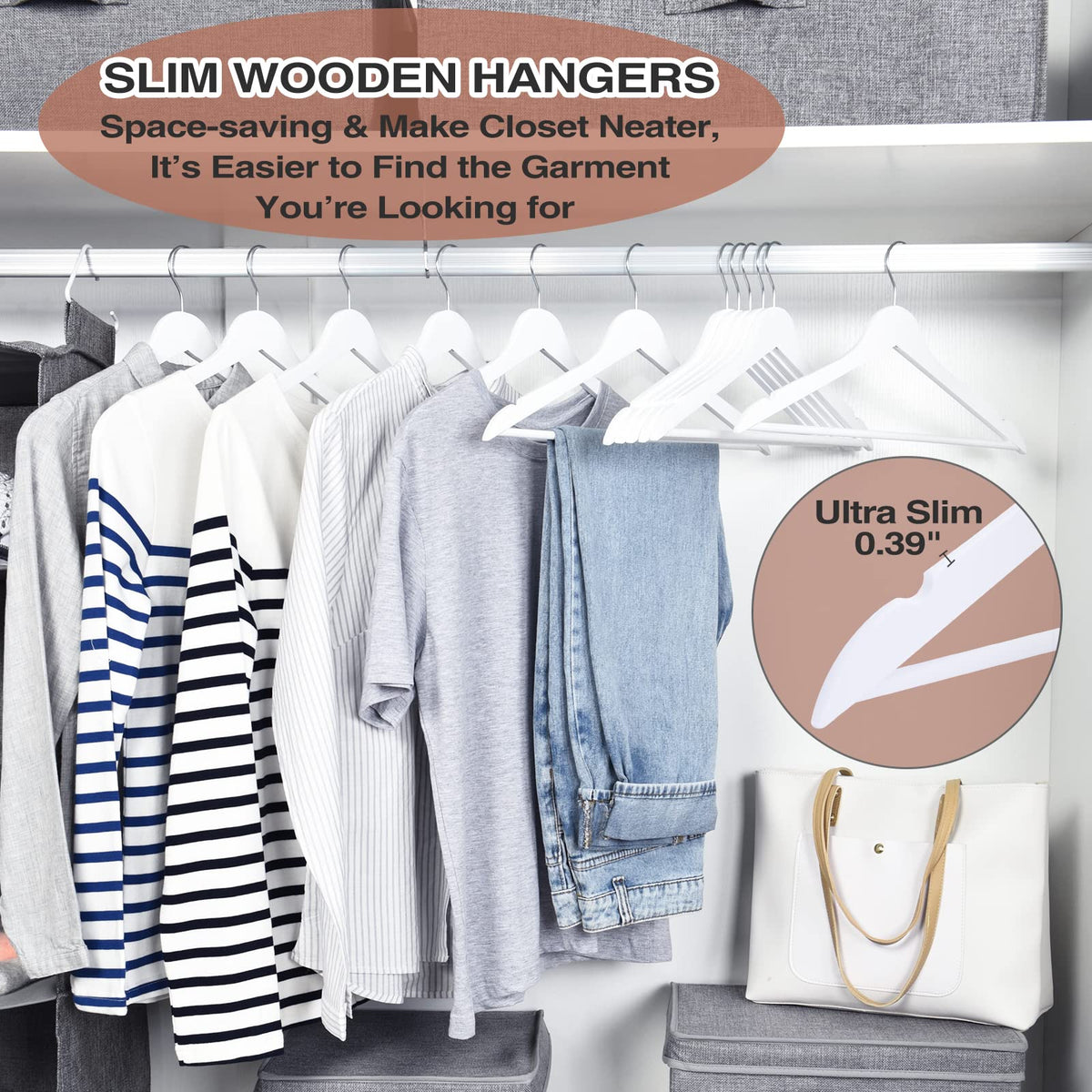 ?Solid Wood Hangers: Made By 100% Grade A Hardwood, Delicate Polishing By Hand And The Main Body Is Connected By Tenon Structure, Lightweight Yet Durable, No Burrs On Surface. Painting With Elegant White Color, Which Will Extend The Lifespan For Wooden Hangers. ?Slim Design: The Thickness Of Our Thin Wood Hanger Is Only 0.4'', Thinner And Lighter Than Other Clothes Hangers Wood, Use Less Storage Space, Store More Clothes, And Easy To Carry. ?Wooden Coat Hangers With Upgraded Contoured Shoulder: Ergonomic Shoulder With Streamlined Look, Keeps The Original Shape Of Clothes And Gets Rid Of Winkle, Smooth Finish Will Protect Your Valuable Clothes From Snagging & Pilling. ?Precisely-Cut Notches & Horizontal Bar: Well-Sanded U Notches With Splinter-Free Finish, Keep Tank Tops, Vests, Camisoles Secured In Place. The Round Bar Is Firmly Assembled On The Wood Coat Hangers, Perfect To Hang Trousers, Towels, Socks Etc. ?360 Rotating Chrome Hook: 360 Degree Swivel Hook With Rust-Proof Chrome Plating, Convenient For Hanging And Taking Clothes. Heavy Duty Steel Hook Of Wooden Suit Hanger Fits All Standard Closet Rods, Sturdy Enough To Hold Winter Overcoat.