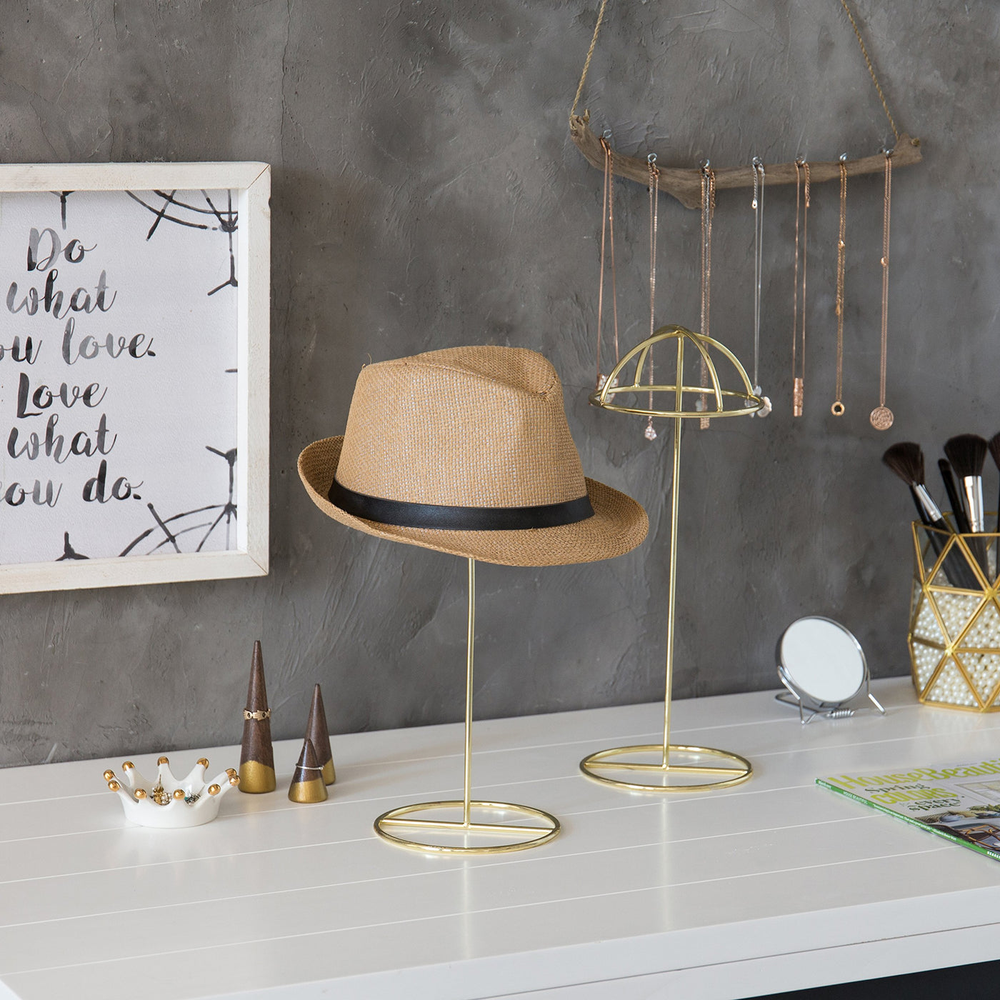 Mygift 14-Inch Brass-Tone Metal Wire Hat Holder Display Stand, Tabletop Wig, Toupee, Cowboy Hat, Fedora Rack, Set Of 2