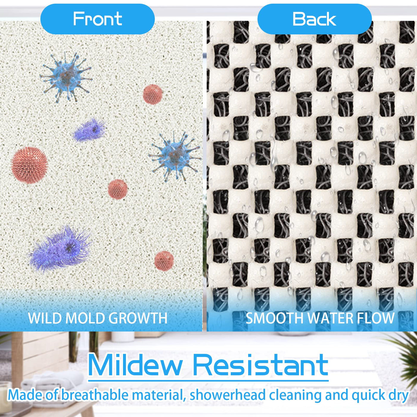 Improve Your Shower Quanlity Have You Ever Experienced Any Slipping And Tripping Accidents In Your Bathroom? Your Family Still Can Not Enjoy A Daily Shower Or Tub Due To The Wet And Cold Floor? Always Spend Too Much Time To Clean Up Your Moldy Mats? If You Have One Or More Above Problems, You Should Try Our Non-Slip Quick Drying Bath Mats To Solve Your Concerns. Water Permeable Porous Structure Never Intercepts The Foam And Water Flow, Which Decides This Mat Is Easy To Take Care Of And Uneasy To Get Terribly Moldy. Non-Slip Drain Bottom Made From All Materials Of High Quality, The Durable Lattice Networks On The Bottom Can Help The Mat Firmly Stay Put And Stop Slippery. Easy To Clean Just Rinsing The Foam Or Hairs Off The Stall Mat With Water.Hanging The Mat Over The Tub Or Shower Door After Each Use. Note: After Each Use, Hang It In A Ventilated Place To Keep The Mat Dry. The Texture Of The Product Can Prevent The Hair From Clogging The Sewer. Please Clean The Mat Regularly.