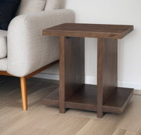 Show off your exquisite taste with this 22-inch brown solid wood sled end table with shelf. This table is made from solid wood in a brown color throughout the base and top. Help to keep your space organized with the included single shelf. A great accent on either side of the sofa or bed, this adorable end or side table is just what you need. You can match it with other pieces to get the ideal look for your place. 22-inch h x 18-inch w x 22-inch d.