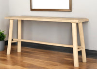 This 66-inch light brown solid wood trestle console table can provide a variety of practical functions such as providing extra storage space, serving as a display area for decorative items or acting as a catch-all for keys, mail, and other small items. This rectangular table has clean lines and plenty of surface area. This unit is crafted from light natural brown genuine hardwoods and is ideal for living rooms, hallways, bedrooms, home offices, and lounge areas. This accent table is not only good looking but multi-functional and practical addition to your space. 30.75-inch h x 66-inch w x 16-inch d.