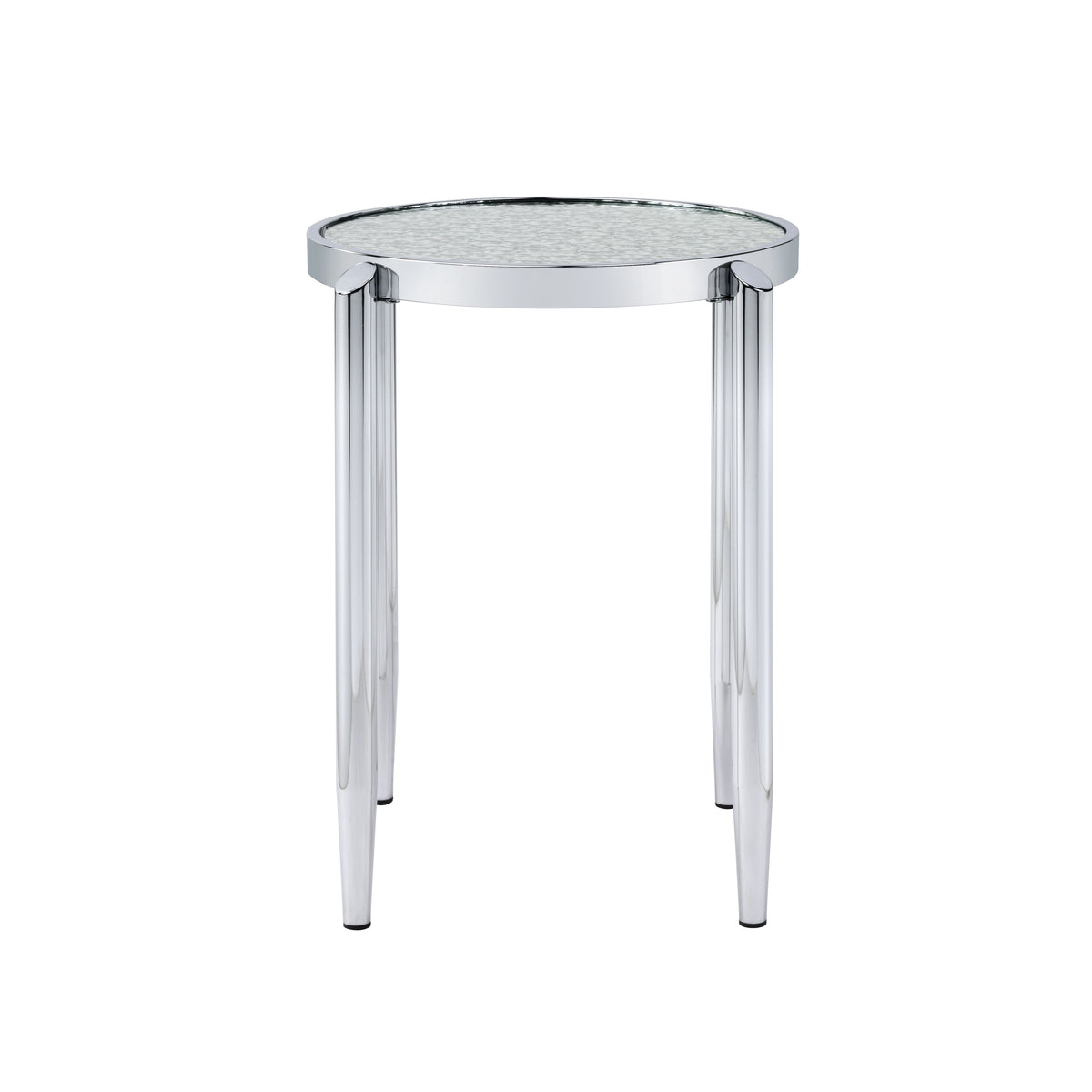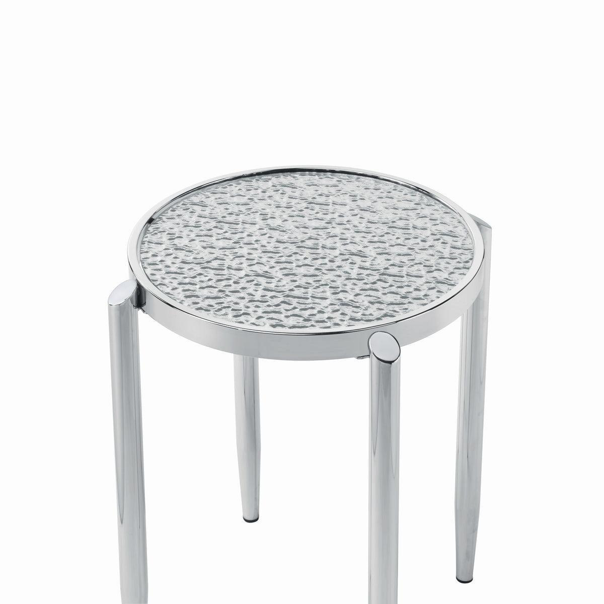 Brimming with ultra-modern appeal, this contemporary end table adds delicacy to any sitting area or nook. The top is beautiful textured glass that creates a decorative detail that adds visual interest. The frame is a sleek design with round, tapering legs set on the outer edge of the frame for an engaging look. Chrome finish adds a gleaming, polished look that blends beautifully with surrounding decor.