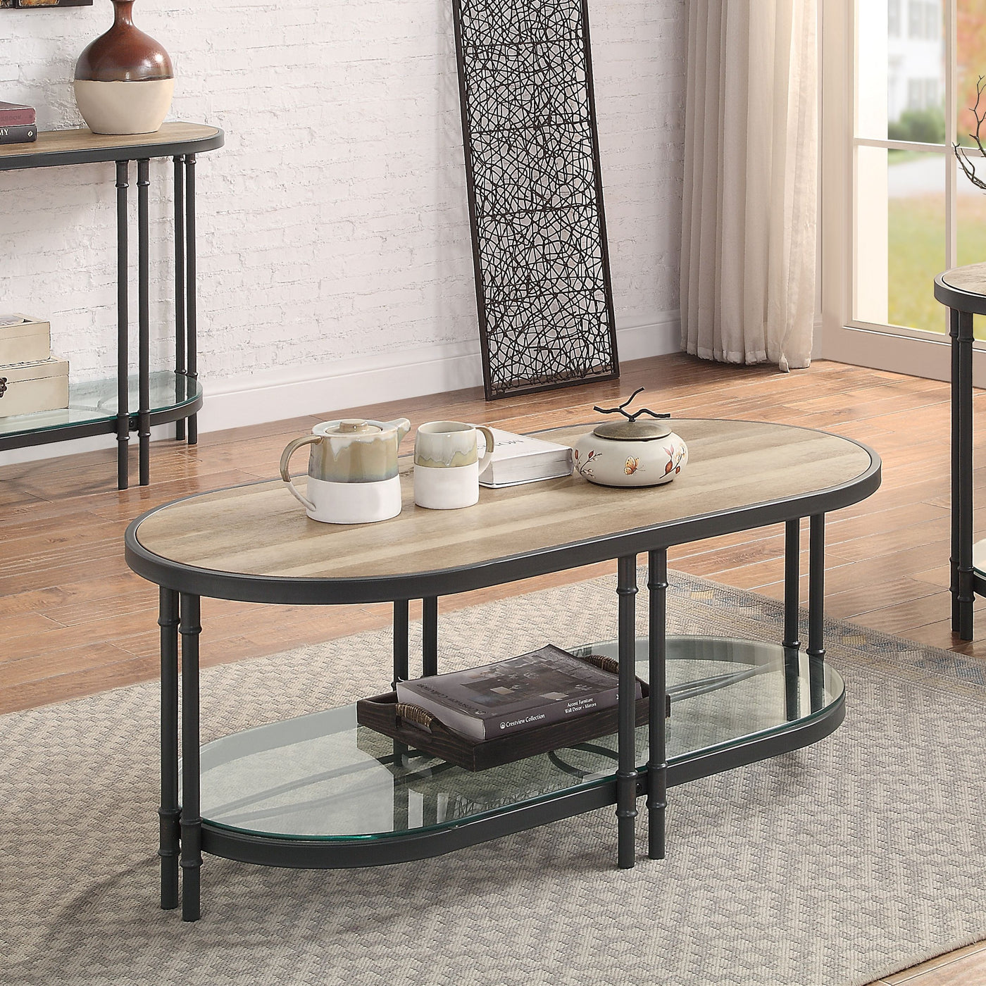 Understated pipe-inspired details add a casual and welcoming ambiance to this oval coffee table. It features a graceful, curved silhouette that encourages flow within your living space. The frame boasts a sandy black finish paired with an oak wood grain finish tabletop perfect for a centerpiece. A lower shelf adds a spot for books and additional decor and features clear glass construction for a lightened finishing touch.