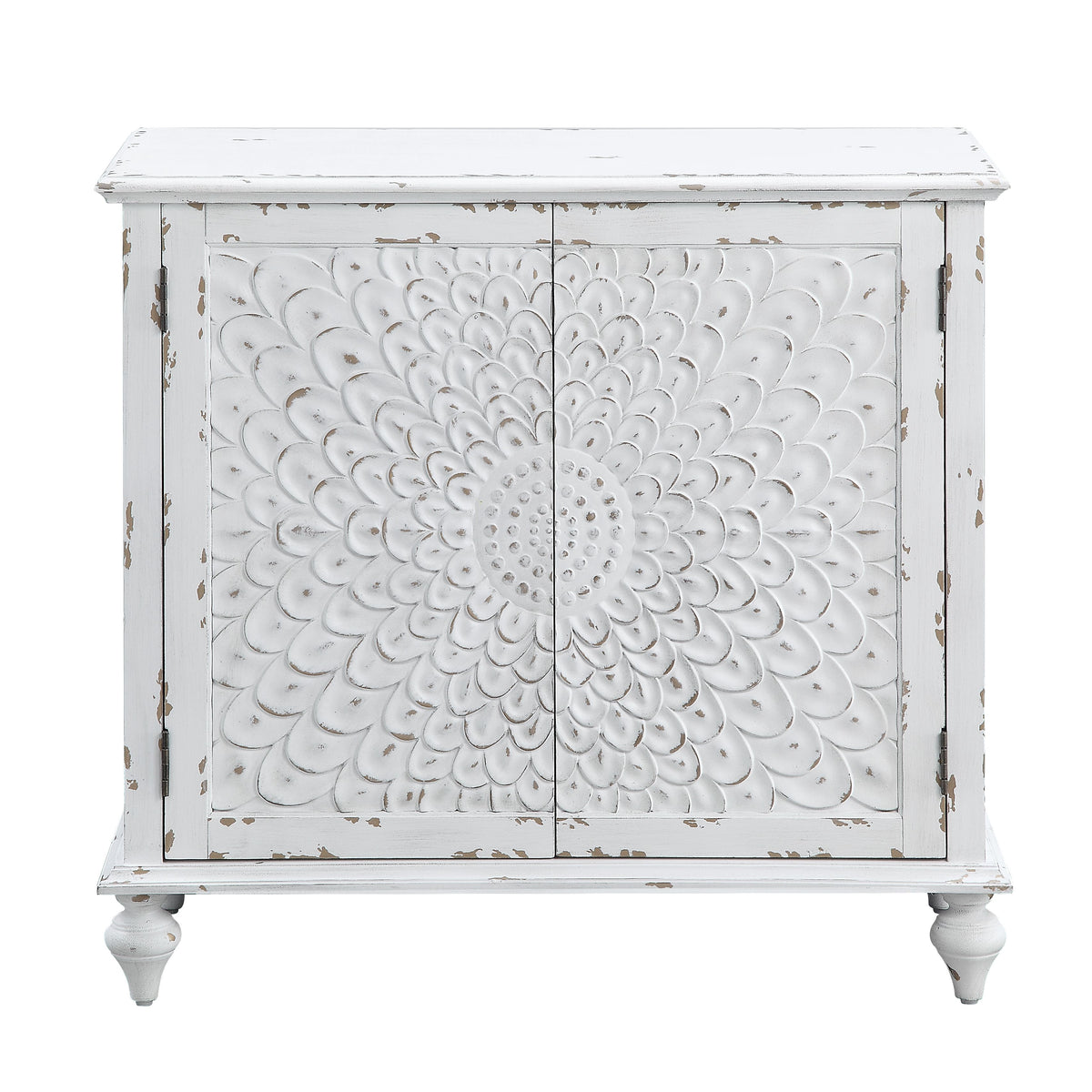 Enjoy this dreamy design style that embraces a worn, live-in look and makes for a stunning focal point in the house. Sitting atop elegant bun turned legs, the cabinet features an antique white finish for a distressed shabby chic look. The classic flower design with overlapping petals on the door front infuses this inviting look with artful appeal. Two doors open to reveal two compartments for ample storage space.