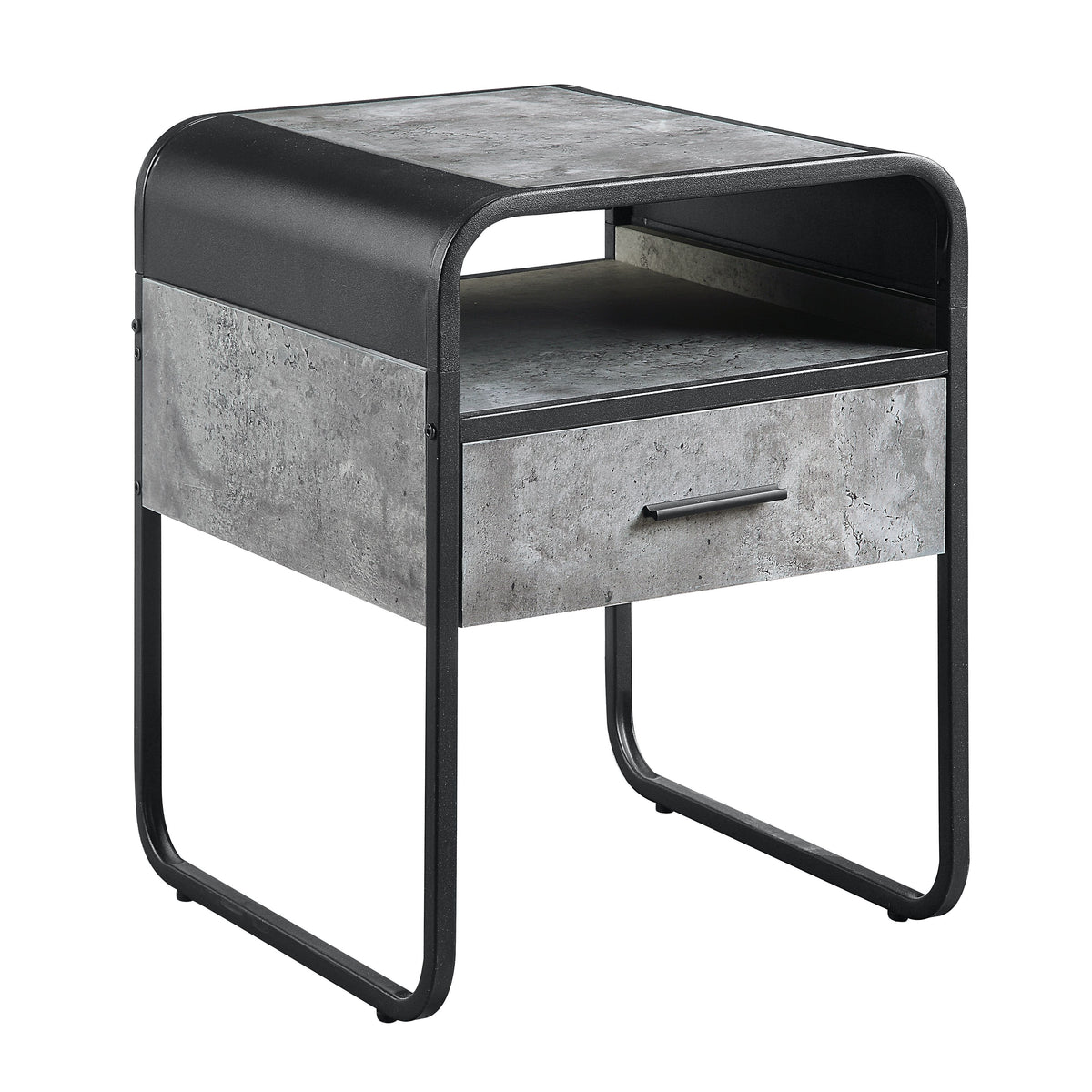 Bring a little Industrial style to the living room with this end table. This square end table features a grey concrete finish, black metal frame, and a streamlined silhouette for the look of a modern Industrial style. The open shelf and drawer are perfect for your books, magazines, remote controls, or any other items.