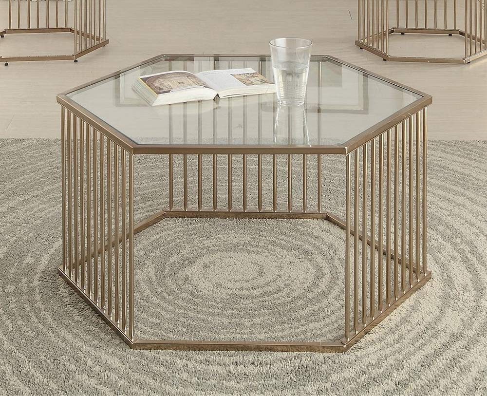 Acme Furniture 81240 Oaklie Coffee Table, Champagne & Clear Glass. Hexagonal table. Metal frame. 5mm clear tempered Glass Top. The country of Origin of the product is Taiwan.