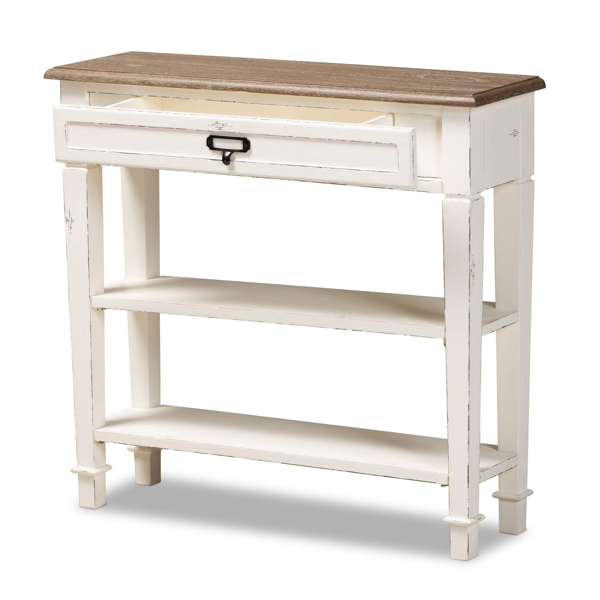 Boasting a white-streaked and distressed finish plus plenty of storage space via two shelves and one drawer, our Dauphine Traditional French Accent Console Table-1 Drawer unifies fashion and functionality. The genuine mindi-wood top features a white-streaked natural veneer that pairs perfectly with the distressed white finishing that comprises the remainder of this console table. Black metal drawer handles offer attractive contrast. Superb value in a discount-furniture item.