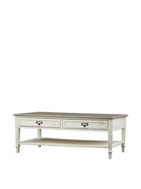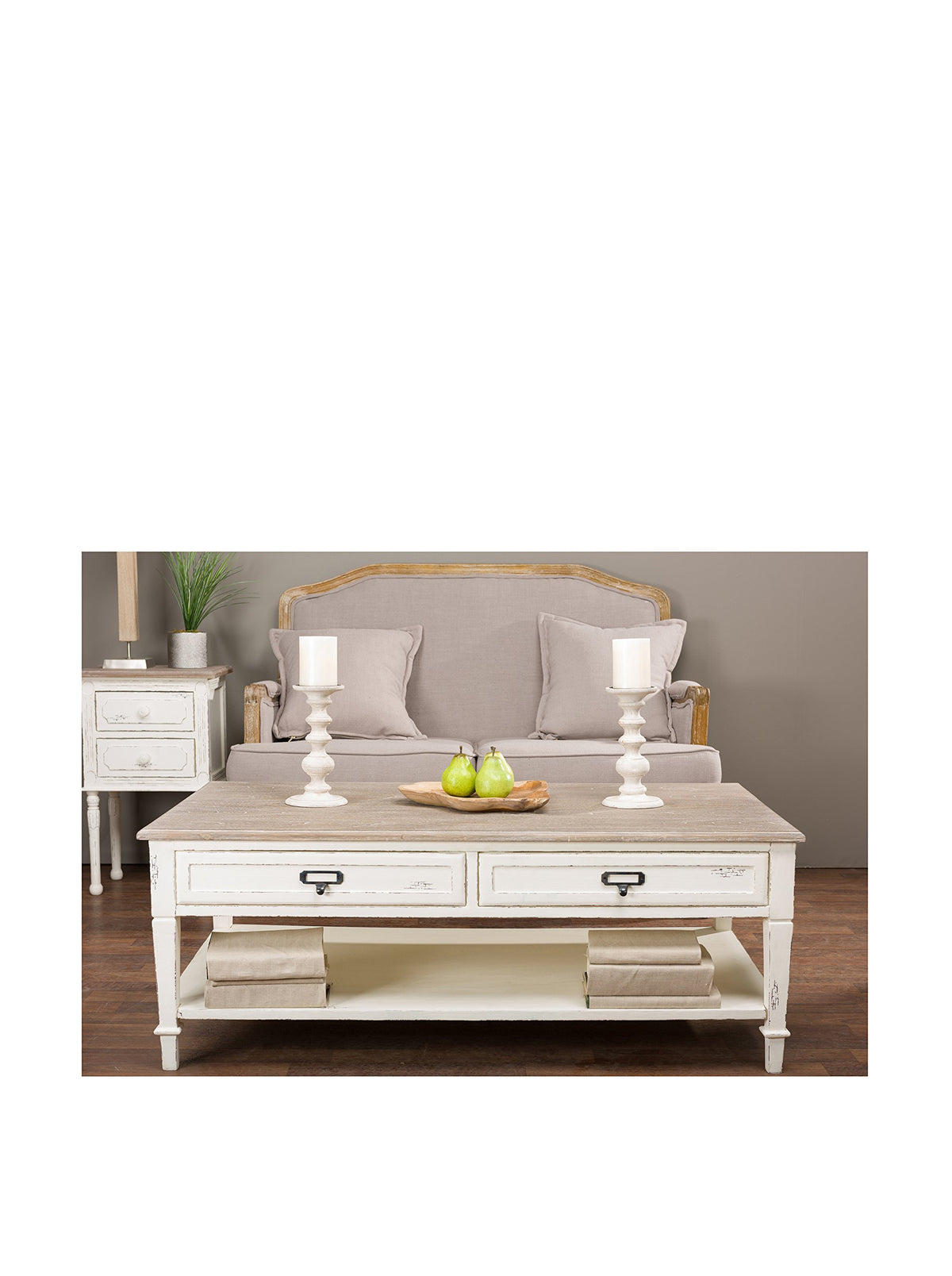 Boasting A White-Streaked And Distressed Finish Plus Plenty Of Storage Space Via Four Drawers And One Shelf, Our Dauphine Traditional French Accent Coffee Table Unifies Fashion And Functionality. The Genuine Mindi-Wood Top Features A White-Streaked Natural Veneer That Pairs Perfectly With The Distressed White Finishing That Comprises The Remainder Of This Coffee Table. Black Metal Drawer Handles Offer Attractive Contrast. Superb Value In A Discount-Furniture Item.