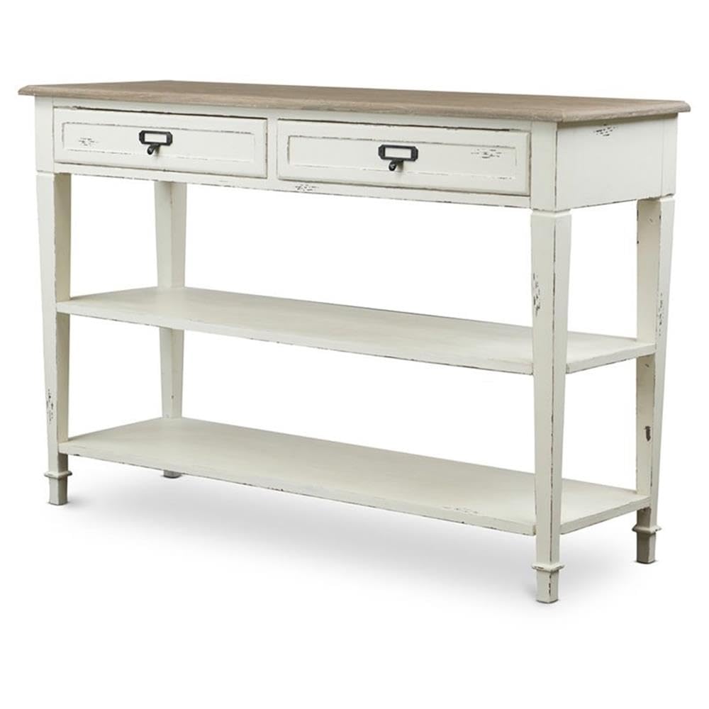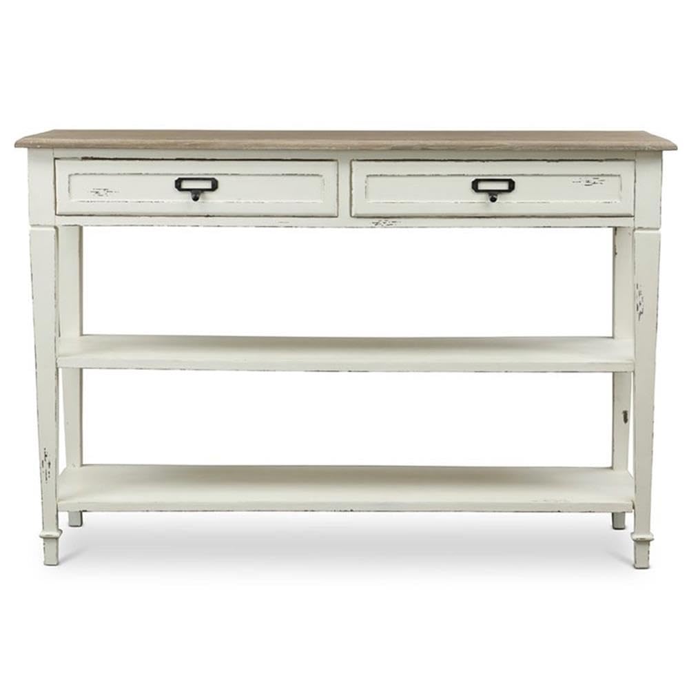 Boasting A White-Streaked And Distressed Finish Plus Plenty Of Storage Space Via Two Drawers And Two Shelves, Our Dauphine Traditional French Accent Console Table Unifies Fashion And Functionality. The Genuine Mindi-Wood Top Features A White-Streaked Natural Veneer That Pairs Perfectly With The Distressed White Finishing That Comprises The Remainder Of This Console Table. Black Metal Drawer Handles Offer Attractive Contrast. Superb Value In A Discount-Furniture Item.