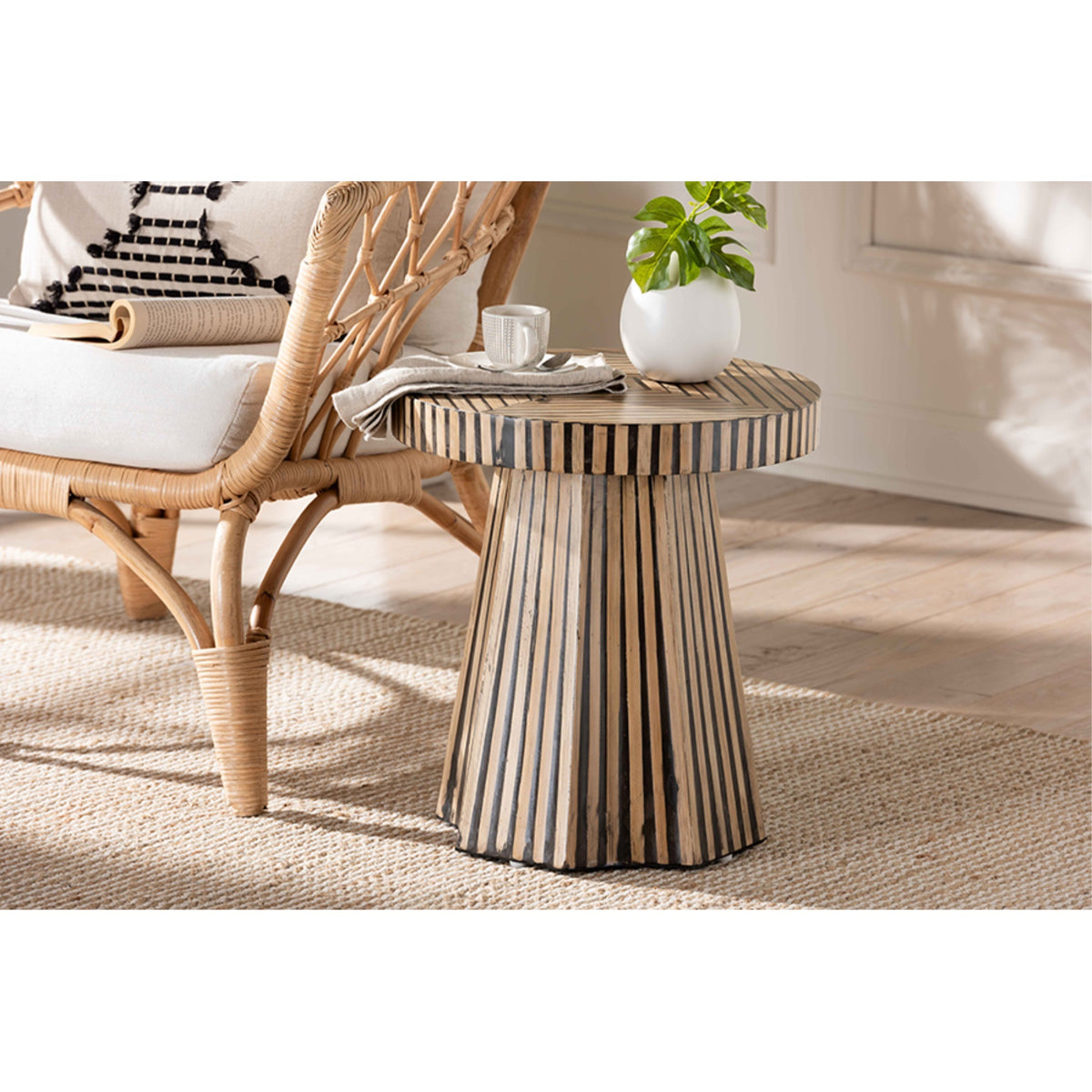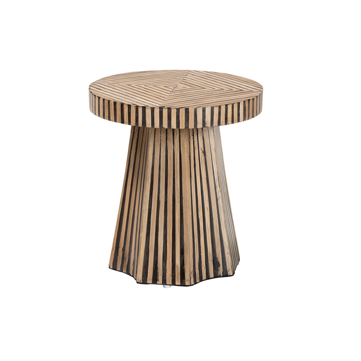Add a piece of robust exotic flare to your space with the lovely Devika end table. Made in Vietnam, this bohemian piece is crafted from bamboo wood. Its round tabletop accommodates your daily needs while the geometric design of the wood lends enticing visual flare. The Devika will arrive fully assembled utilizes a tapered, sculpture-like base for excellent stability and support in charismatic design. Bestowing an air of serenity, the Devika end table is an attractive complement to any arrangement.