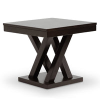 Give your home an element of unmatched polish: the Everdon Designer End Table is packed with contemporary style. The stately Everdon End Table is crafted in Malaysia with a sturdy engineered wood frame. To clean, wipe the wooden surfaces with a dry cloth. The Everdon Collection also includes a matching sofa table, coffee table, pub stool and pub table set (each sold separately). 21.6"W x 21.6"D x 20"H, base : 15.3"W x 15.3"D x 1.375"H, table top thickness: 2.75".