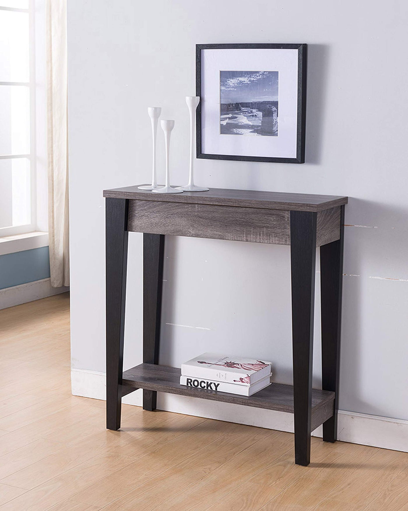This Black And Gray Console Table Is Simple And Stylish Table. The Elegantly Shaped Legs Look Stylish From Any Perspective In Modern Or Traditional Spaces. Features Large, Smooth Top Surface With Bottom Shelf For Open Storage. A Perfect Accent To Your Living Room, Hallway Or Entryway.