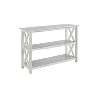 Embellish Your Entire Space With The Most Appreciated Farmhouse Style Entryway Table. Replicating 2 Tier Design Structure, It Has 2 Open Bottom Shelves Which Makes It Extremely Useful And Functional. Wooden Block Legs With X Shaped Accents Adds To The Beauty And Strength. The Washed White Finish Adds To The Crudeness And Raw Appeal.