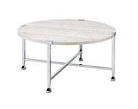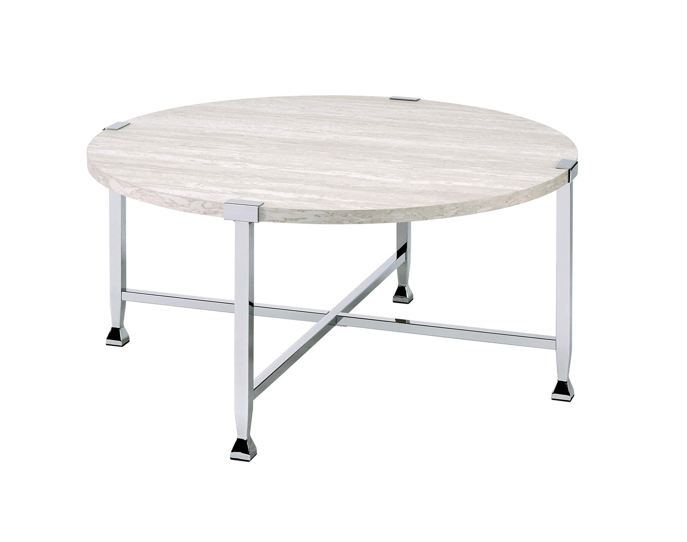 Integrate Your Living Space With Luxury And Beauty By The Inclusion Of This Elegant Coffee Table. It Features A Metal Base In Silver Finish With Interconnected Legs Forming An X Shape. The Table Top Is Round, Made From Wooden Displaying Grain Details.