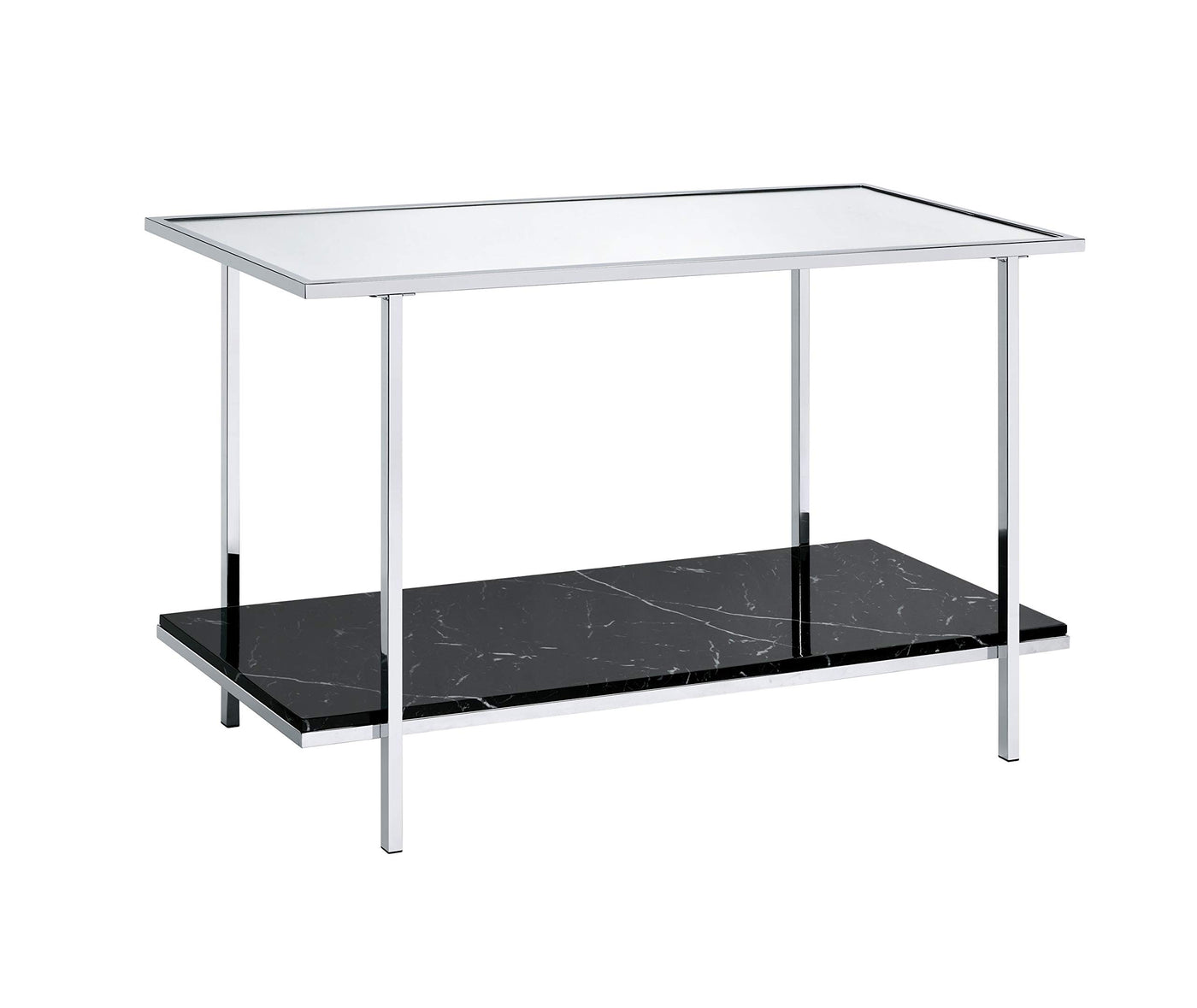 Magnify The Beauty Of Your Home With The Inclusion Of This Well Designed Console Table. It Features A Metal Frame In Silver Finish Enchasing A Rectangular Mirror Tabletop And A Rectangular Open Bottom Shelf Made From Faux Marble In Black Finish. It Is Supported On Square Metal Legs For Stability And Strength.