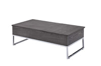 Modern Style Abounds With This Handsome Coffee Table. Constructed From Engineered Wood, Veneer In A Grey Finish With Sled Style Chrome Metal Base, The Minimalist Style And Neutral Color Scheme Of This Table Will Create A Contemporary Look That Will Mesh With Any Existing Decor. The Wooden Top Of This Table Is Divided Into Two And They Lifts Up To Reveal Storage Underneath And Create A Higher Surface For You To Play Games, Host Snacks, And More. The Table Will Form A Perfect Centerpiece For Your Conversation Area And Will Provide You And Your Guests Ample Of Space For Setting Drinks, Snack Plates, Purses, Or Display Pieces.