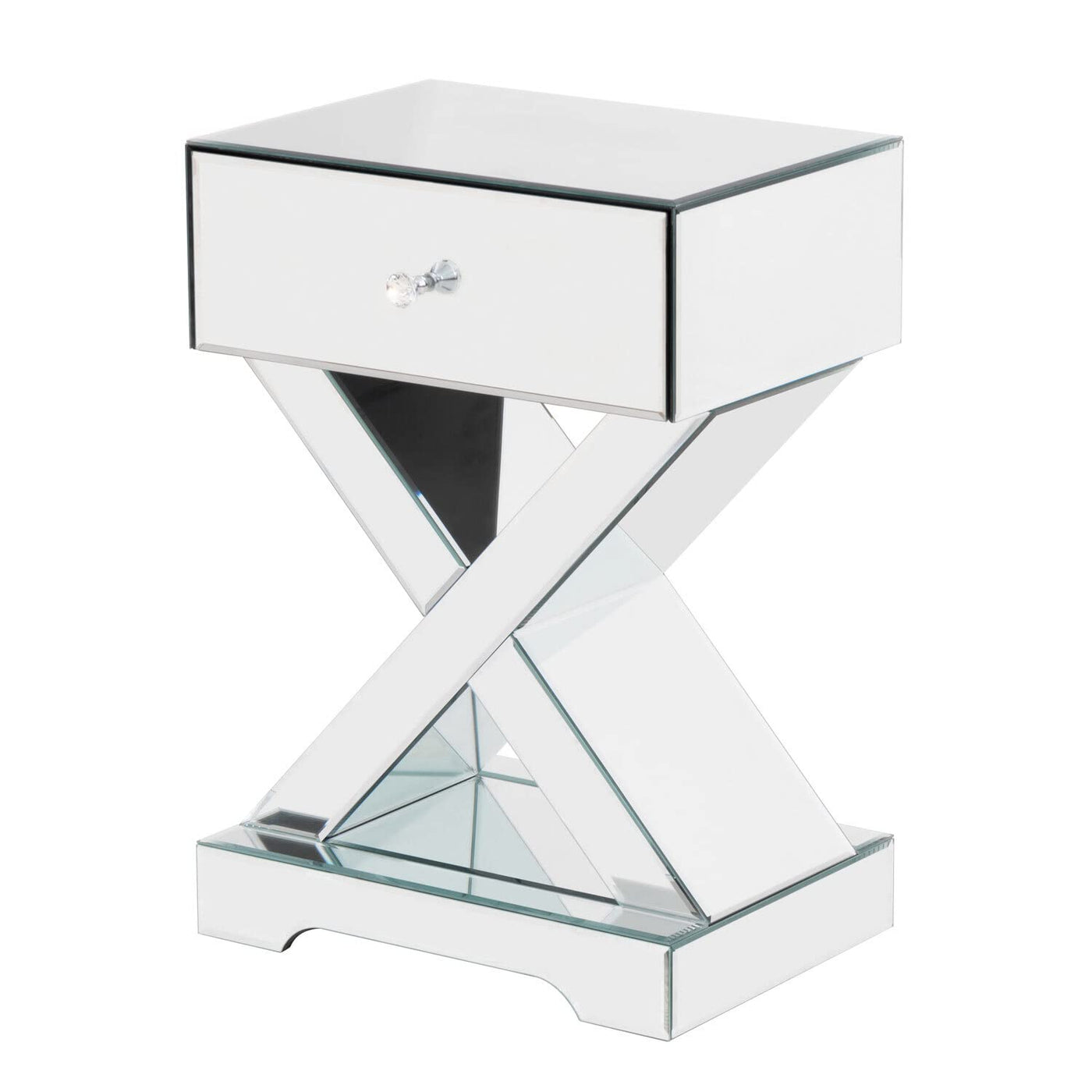 This Better Home Products mirrored nightstand or bedside table with one drawer is sure to add sparkle to your bedroom or living room. Our nightstand includes a single easy pull-out drawer for handy storage of life's little essentials. Side tables are a great way to flank your sofa, use as an accent next to your favorite chair, or can even be used bedside. This nightstand would be an elegant addition to not only a bedroom set but any room in your home.