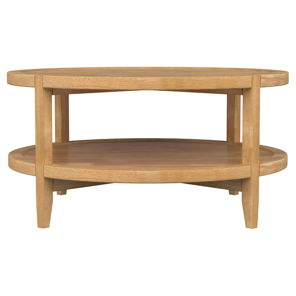 Includes: One (1) coffee table | Modern farmhouse coffee table features timeless wood that suits virtually anywhere | Full lower shelf is the ideal spot for decor, books, or storage of essentials | Warm maple wood grain finish delivers inviting character and casual appeal | Round silhouette encourages an inviting ambiance and adds dimensionality to your space | Construction from Asian hardwood is durable and beautiful, offering rich, organic flair