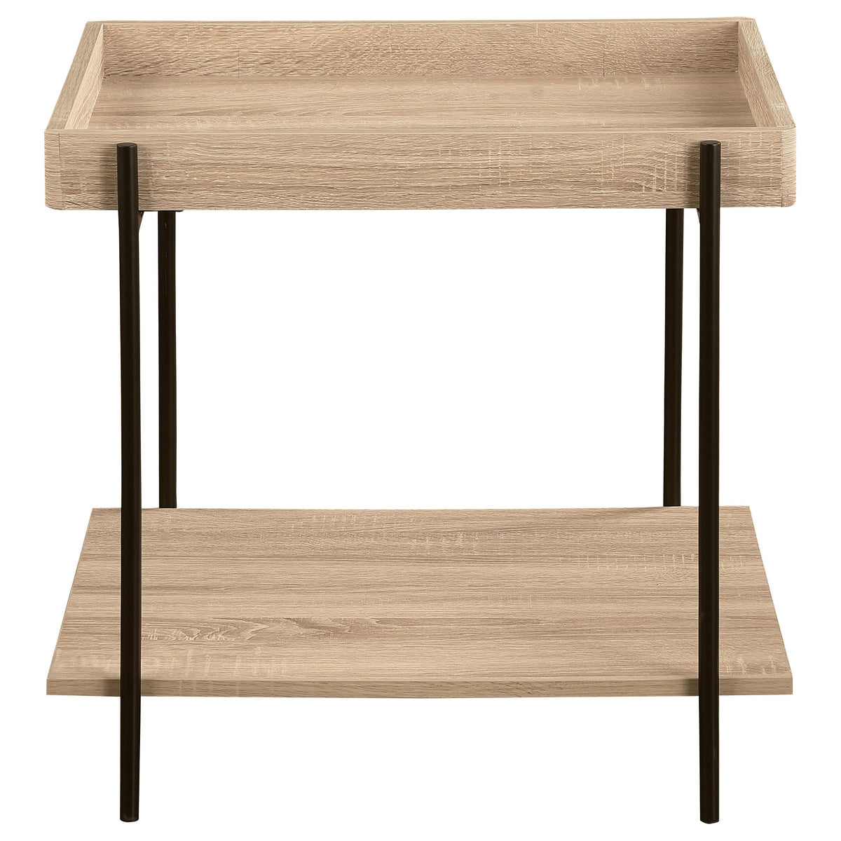 Infuse your space with the contemporary casual vibes of a modern end table, constructed from metal and engineered wood. This charming choice offers a tray-like table top that creates a sense of depth and dimension, perfect for refreshments or a decorative display. Its natural wood-like features are highlighted by a light brown wood grain finish, clean and timeless, lending itself well to a variety of spaces and surrounding decor choices. The table features a slim, black finish metal frame that creates structure, enhancing its modern appeal. It includes a full lower shelf, providing convenient storage or display space for books or personal items.
