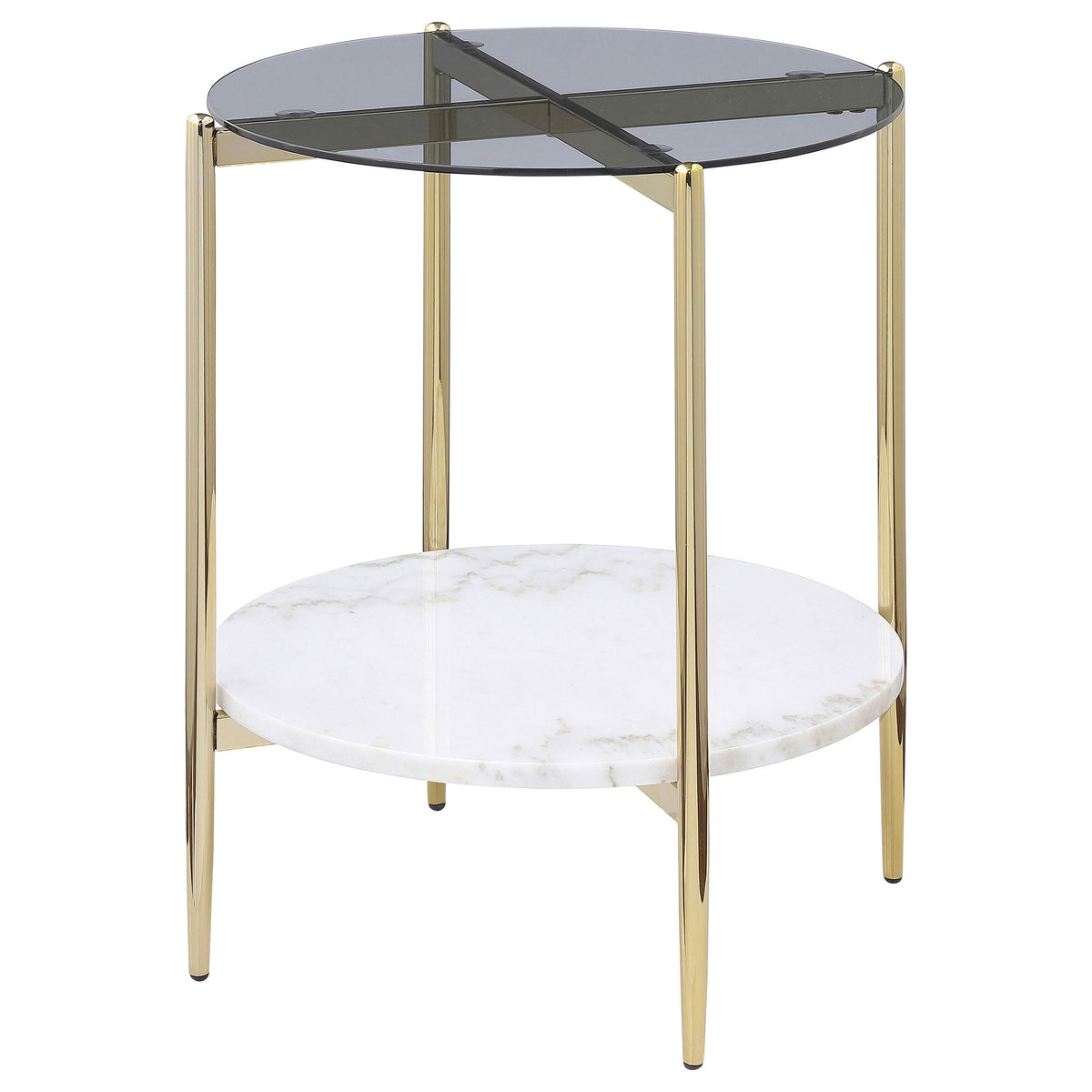 Coaster Home Furnishings Jonelle Round Glass Top End Table White Marble Shelf Gold