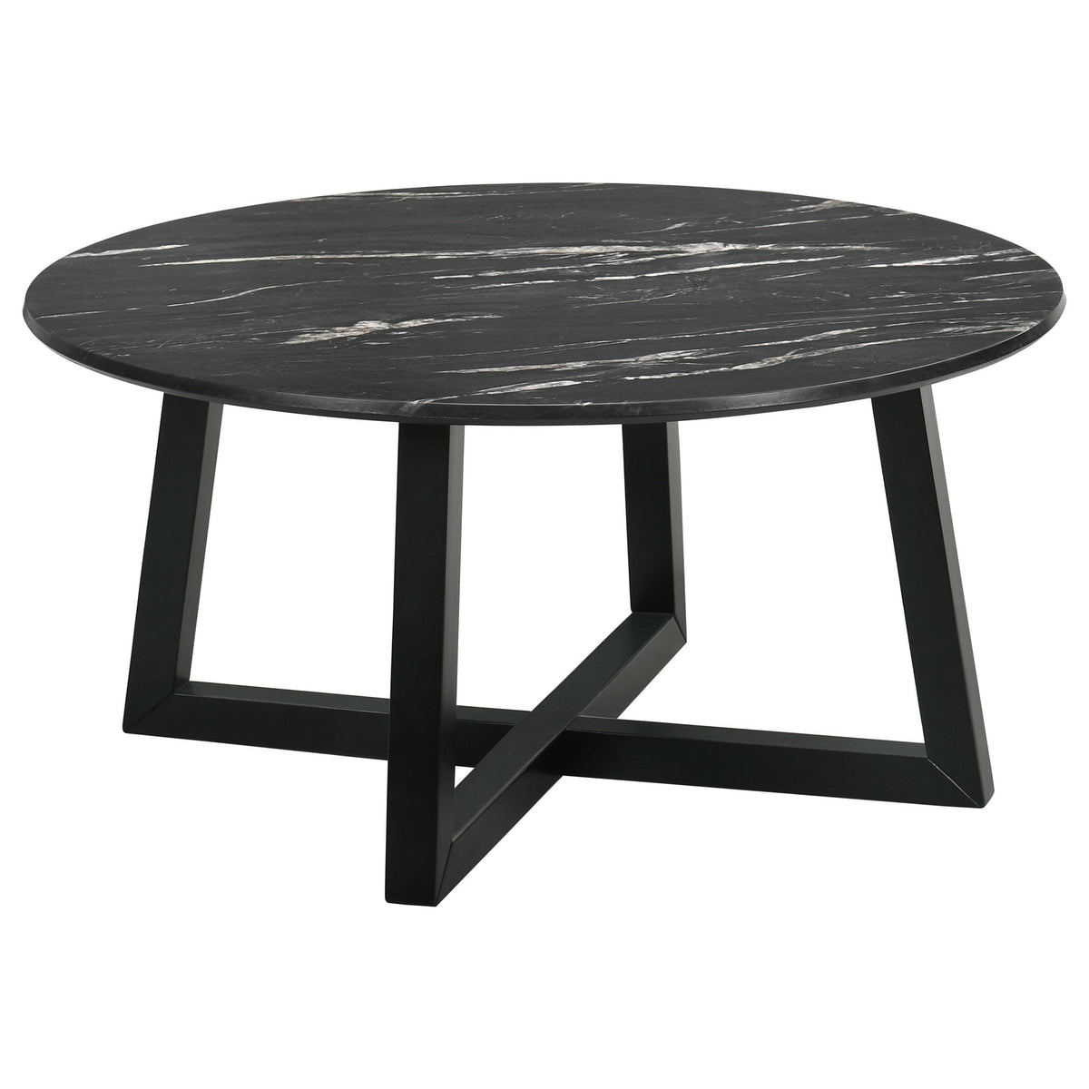 The coffee table stands as a centerpiece, its round form a canvas for the rich, decorative black faux marble that offers the beauty of natural stone with none of its fragility. The high-pressure laminate surface is a triumph of design, melding high durability with ease of maintenance, a savvy choice for the modern home. Its solid wood base, sculptural in its form, lends a steadfast quality, while the marriage of the materials speaks to a sophisticated taste. This piece is a gathering spot for loved ones and a testament to smart living, where style and practicality are in perfect harmony.