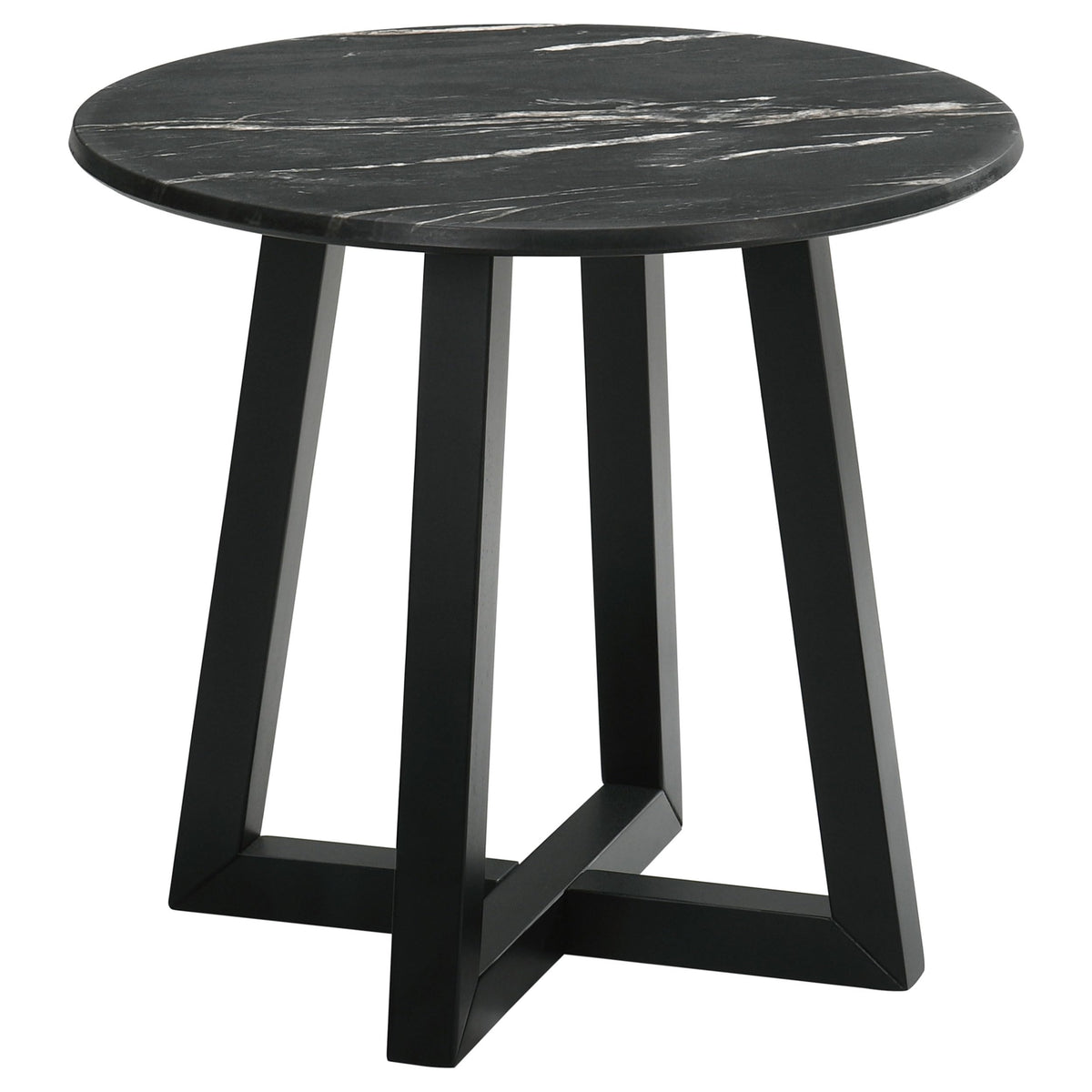 Gracefully poised, the round end table is a modern muse clad in black faux marble, a high-pressure laminate that promises enduring strength and effortless care. This exquisite tabletop, impervious to the whims of daily life, offers the opulent look of marble without its demanding nature, making luxury more accessible and relaxed. Resting on a solid wood base, the table's silhouette is a celebration of stability and elegance, with angular legs that create an intriguing visual dialogue with the smooth curves above. It's a versatile piece that elevates the art of living, turning the simple act of placing down a book or a drink into a moment of understated sophistication.