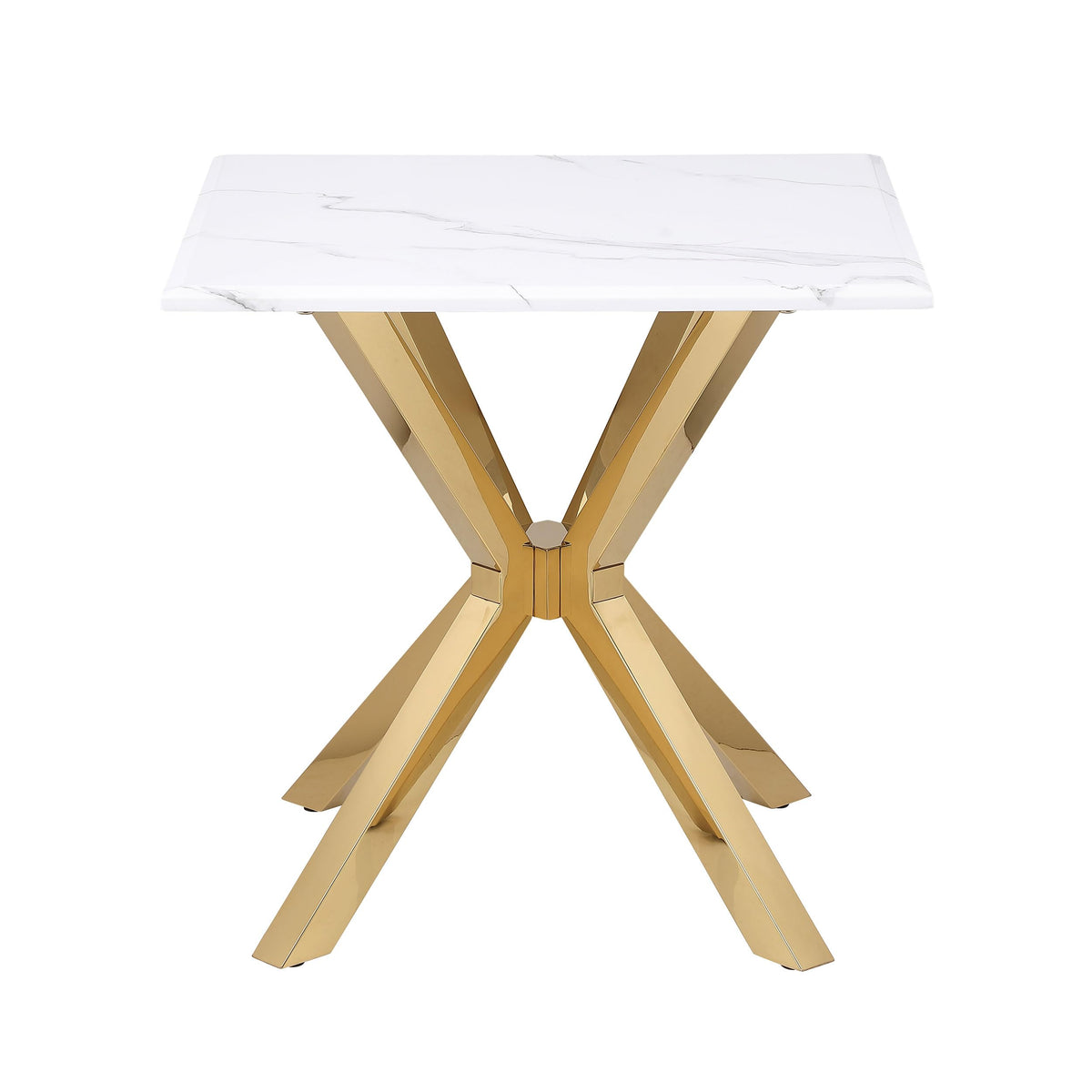 Elevate the sophistication of your sitting area with a modern end table, constructed from stainless steel, engineered marble veneer, and MDF. This rectangular table showcases a beautiful, realistic marble-like tabletop with natural veining, adding a crisp, organic dimension to your space. It stands on a star-shaped, rust-proof base made of beautifully polished gold stainless steel that gleams in the light. The intersecting lines of shiny metal create an elegant presentation that enhances surrounding decor. A beveled edge completes the table, which looks stunning alone or adorned with a vase of fresh-cut flowers.