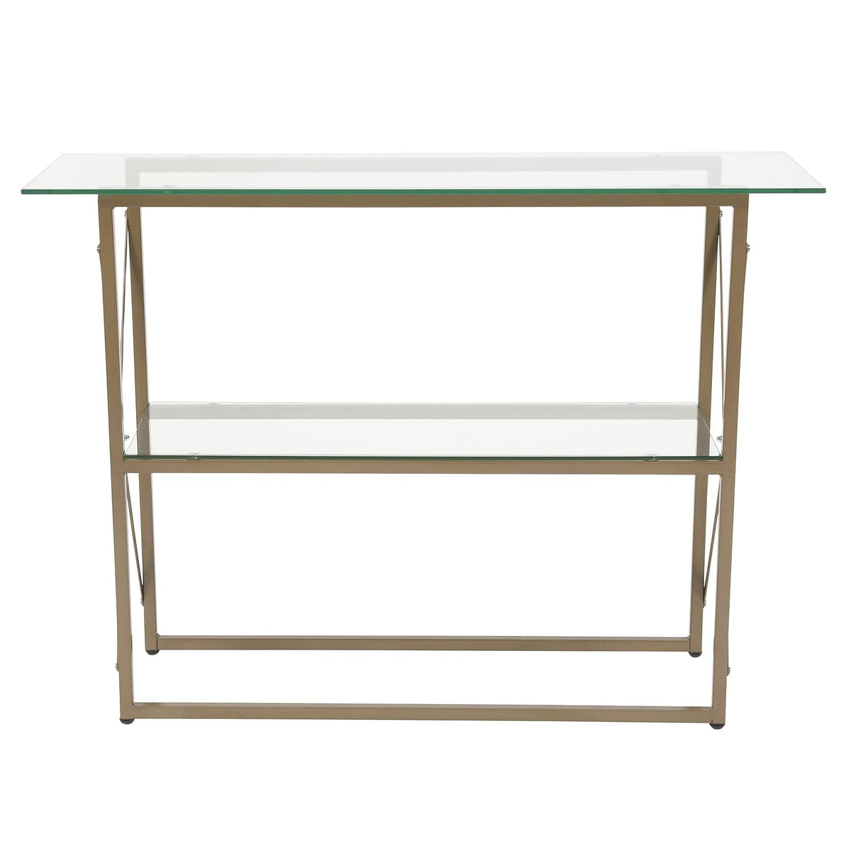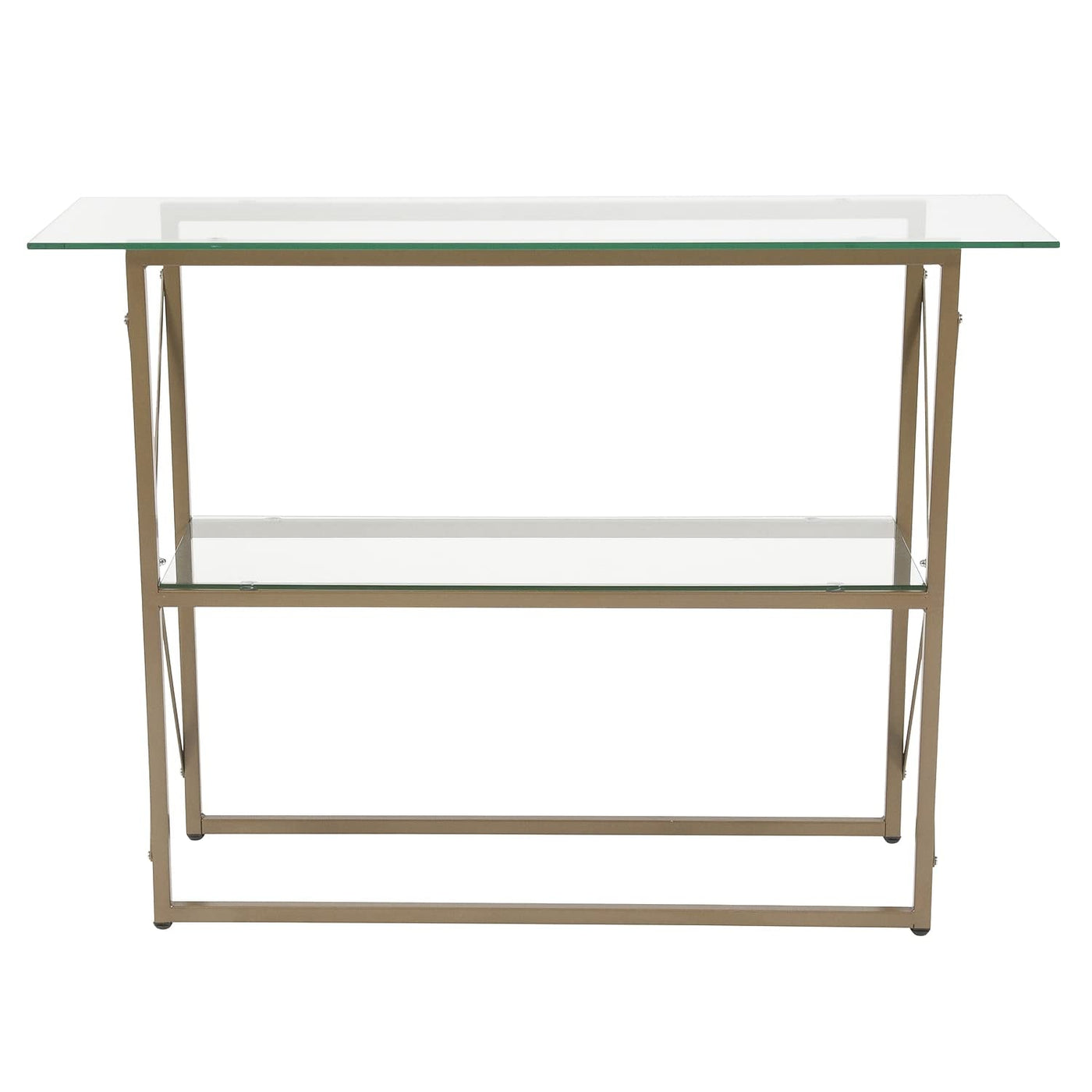 This Console Table Will Look Great In Your Entryway Or Along Any Hall Wall. This 2 Shelf Console Table Combines A Durable, 8Mm Thick Glass Top With A Matte Gold Powder Coated Frame To Provide A Contemporary Look That'S Sure To Tie Any Trendy Room'S Presentation Together. Not Only Does Its Ample Surface Area Serve As A Convenient Space For Holding Customers' Belongings, It'S Also Great For Displaying Magazines, Newspapers, And Brochures. It Also Has An Undershelf For Additional Storage. Plus, Its Modern Design Lends An Attractive, High-End Look.