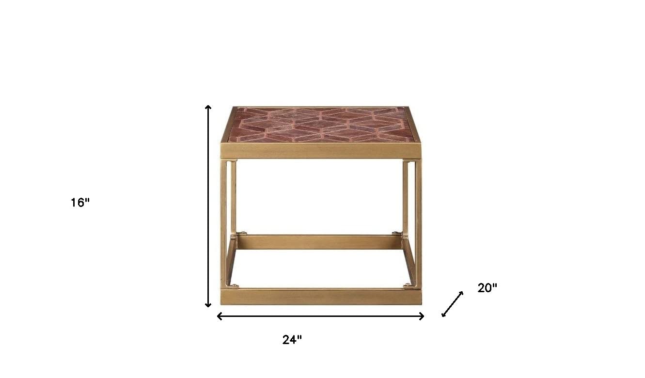 HomeRoots 16" Brass and Warm Brown Leather Rectangular End Table